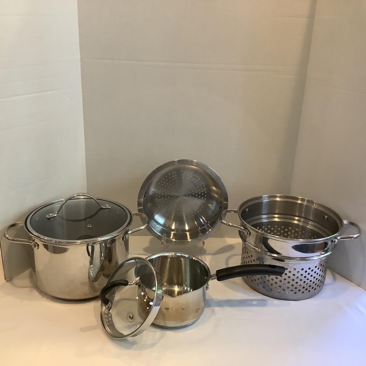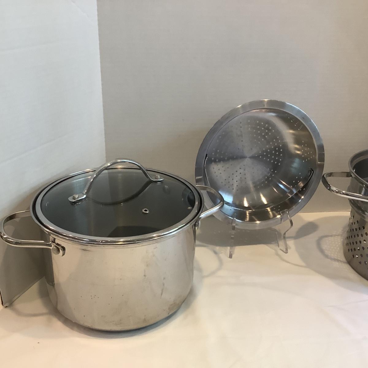 Small sauce pot comes with lid, large stock pot comes with steamer insert and lid