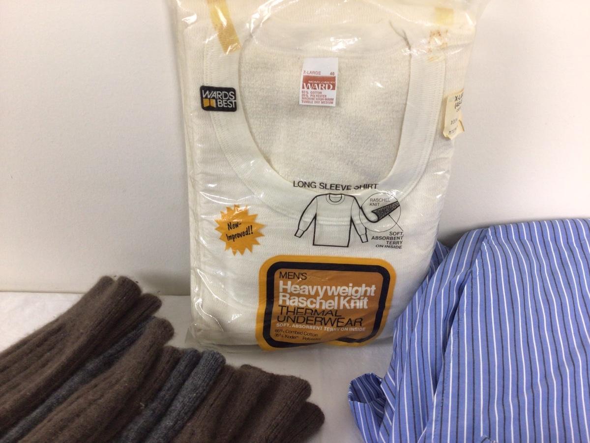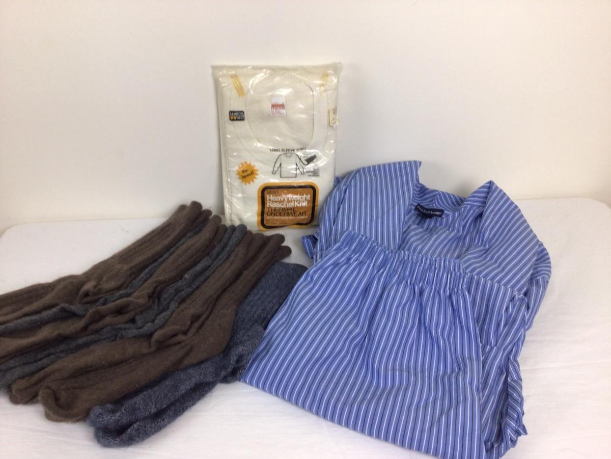 Lot contains large lot of cashmere socks, new old stock long John’s and Ralph Lauren pajama pants and robe xl.