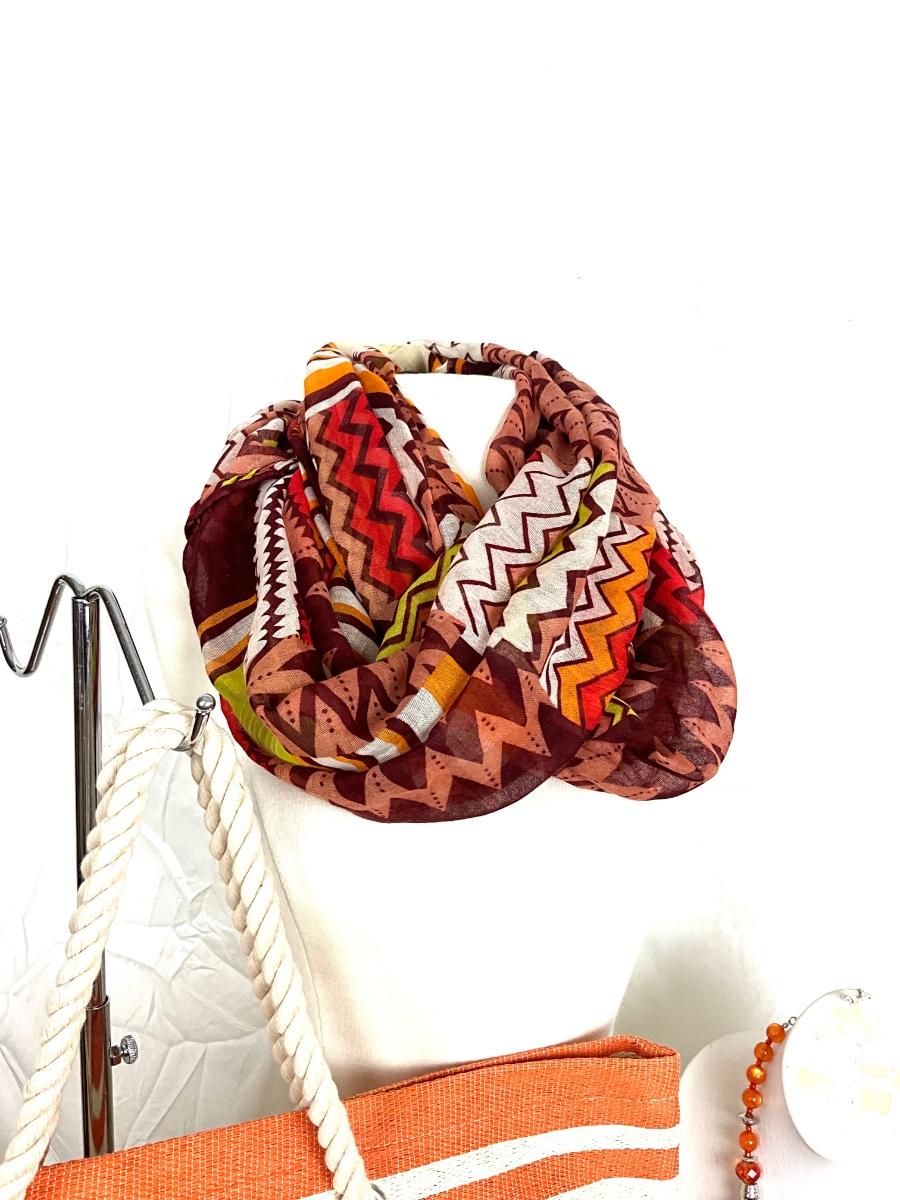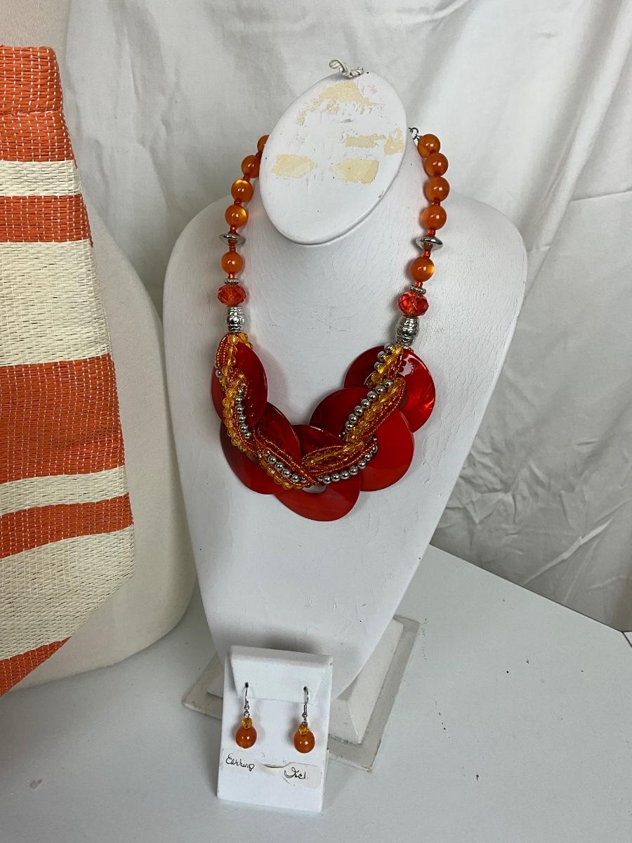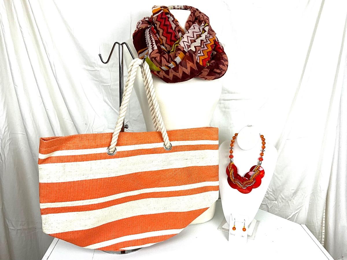 211 Orange and White Beach Bag with Tribal Accent Infinity Scarf, Orange Statement Necklace Set