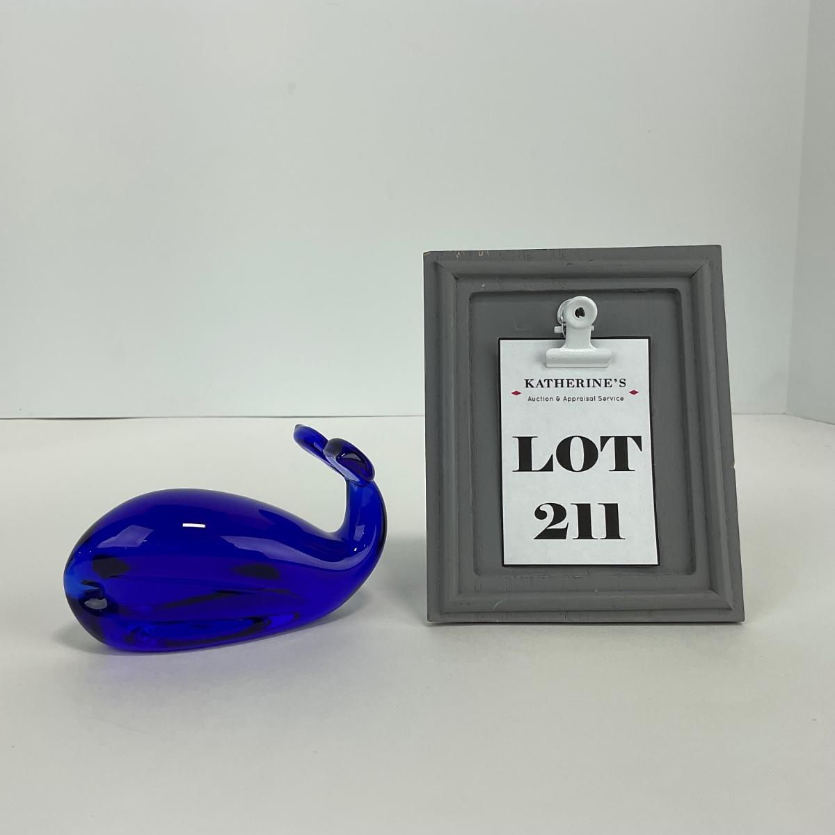 One believed to be Pilgrim or Viking blue glass whale paperweight. 2 1/2 inches tall by 4 inches wide. This piece has no damage, and appears to be in great shape with no visable chips, cracks, or broken pieces. Please see photos for details and condition. Any condition statement is given as a courtesy to a client, is an opinion, and should not be treated as a statement of fact. Reference to condition written, oral or within a condition report shall not be regarded as a full account of condition and may not include all defects, alterations, or restorations. Absence of a condition report does not imply a lot is flawless or lacking imperfections or damage. Katherine’s Auction & Appraisal Service shall have no responsibility for any error or omission. Returns shall not be accepted on the basis of condition. ::: Shipping is available on this lot. If you require shipping you must let us know at the close of the auction. We will coordinate with you after the item has been won. Shipping fees will include insurance up to or exceeding the value of all items being mailed. If you have any questions regarding this lot please contact the auctioneer either via this website, by direct email or by phone. PICK UP TIMES and other important information can be found in the TERMS and DESCRIPTION of the auction. Please take a look for pertinent information. Thanks!