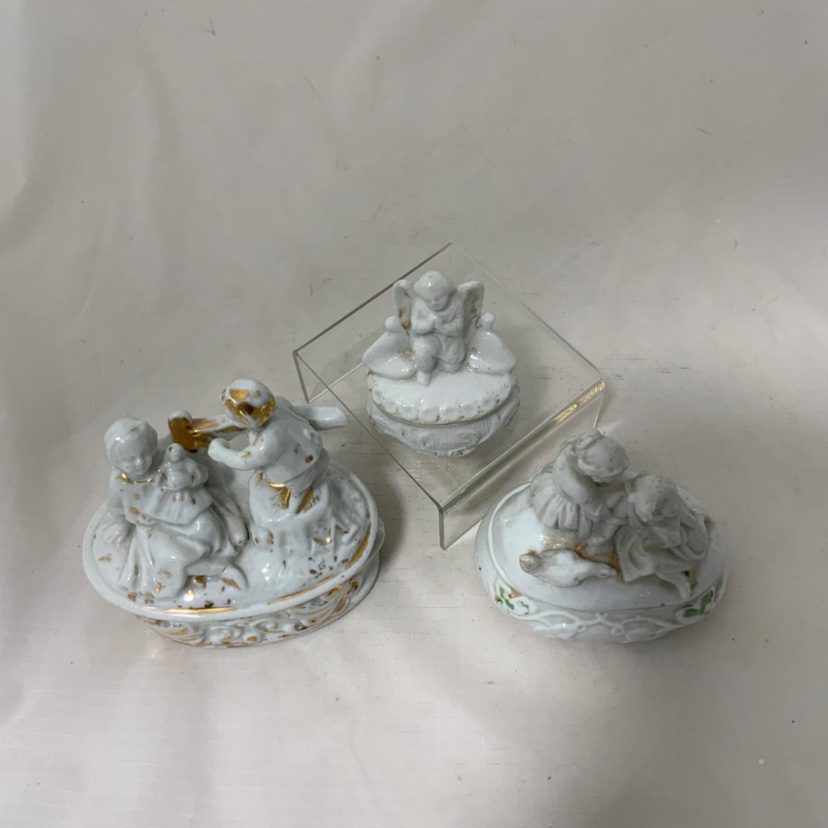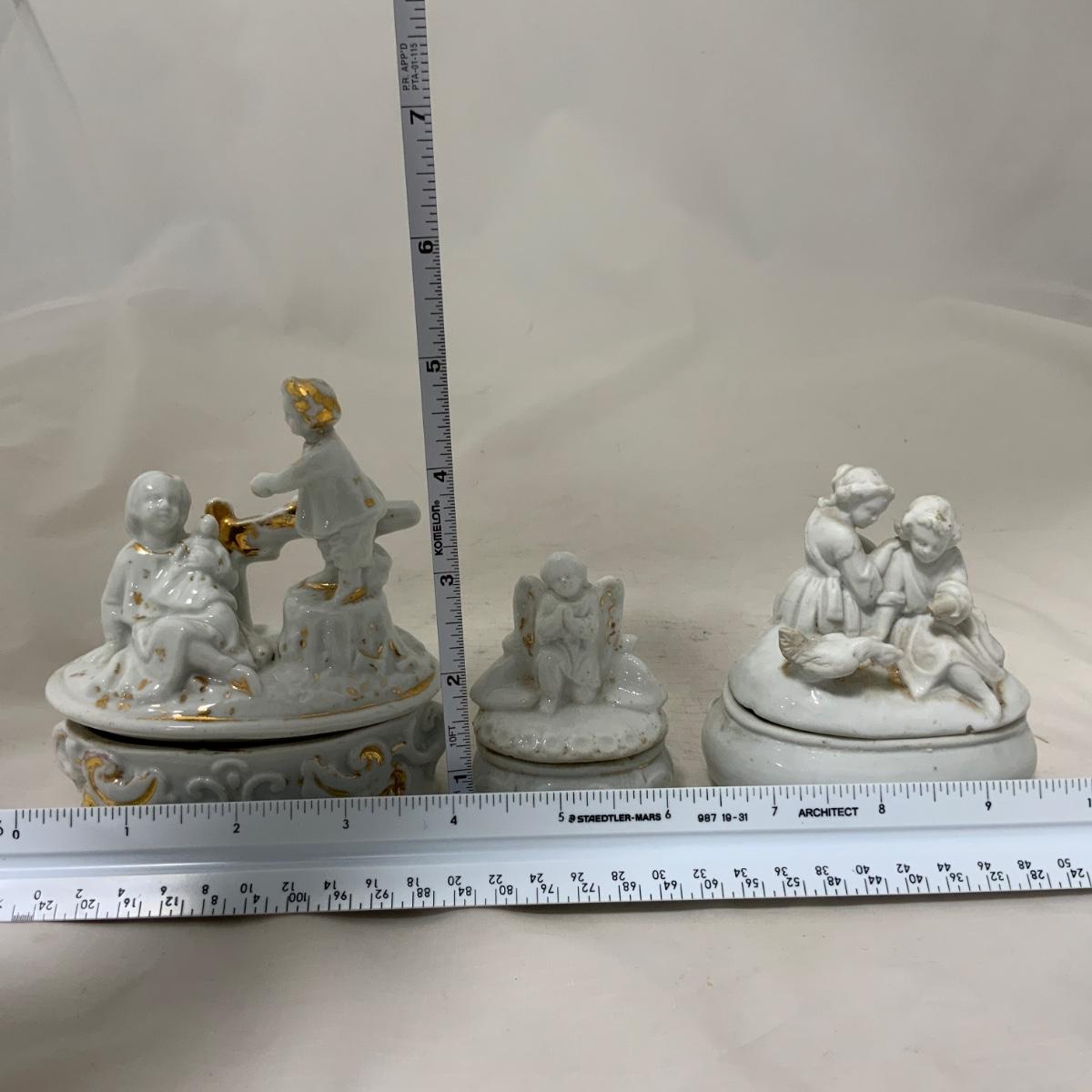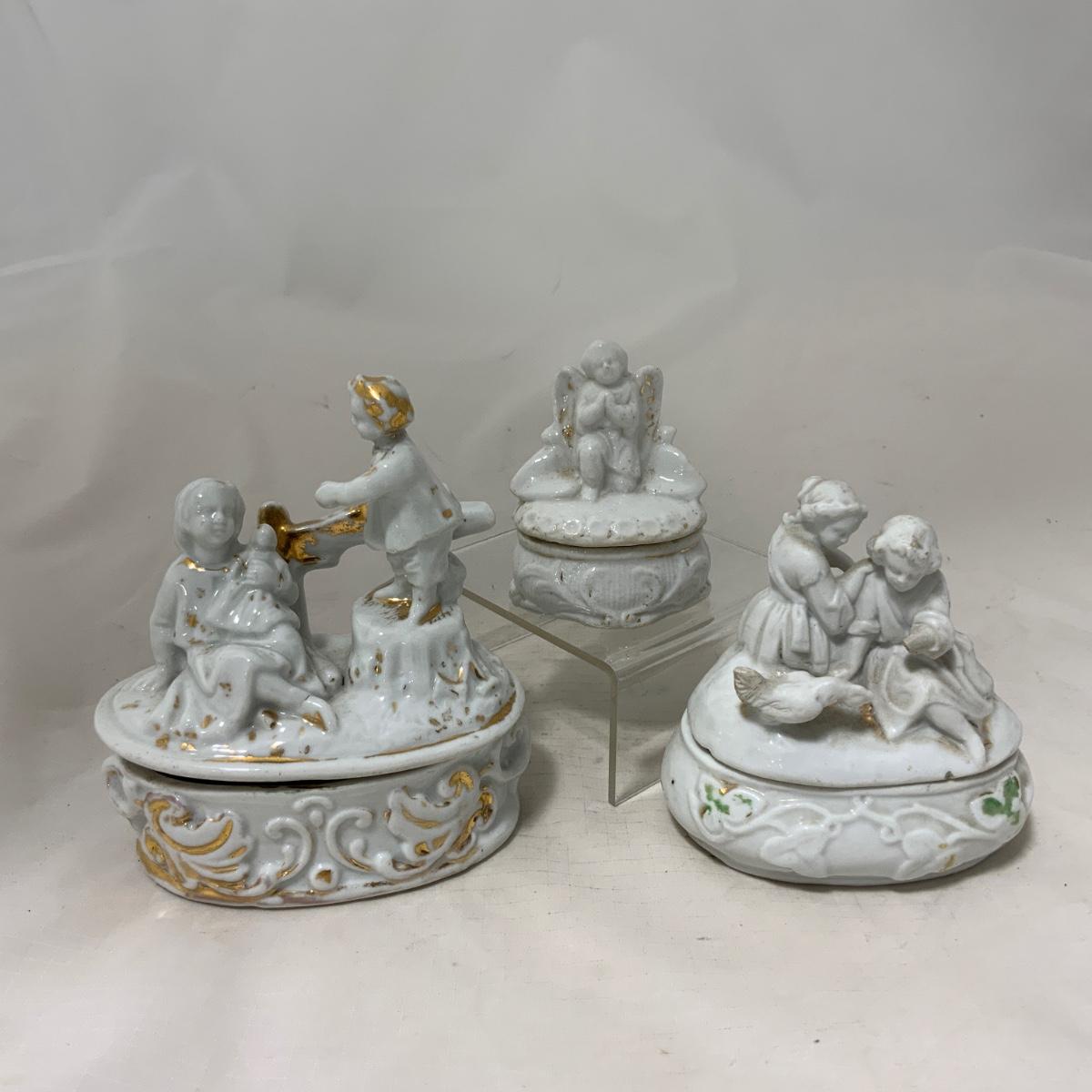Three attractive and unique Porcelain Trinket Boxes. The largest one doesn’t sit perfectly on it’s base, and the smallest angel has a chip out of the base. The medium sized one is just right. Please see photos for details and condition. ::: Shipping is NOT available on this lot. If you have any questions regarding this lot please contact the auctioneer either via this website, by direct email or by phone. PICK UP TIMES and other important information can be found in the TERMS and DESCRIPTION of the auction. Please take a look for pertinent information. Thanks!