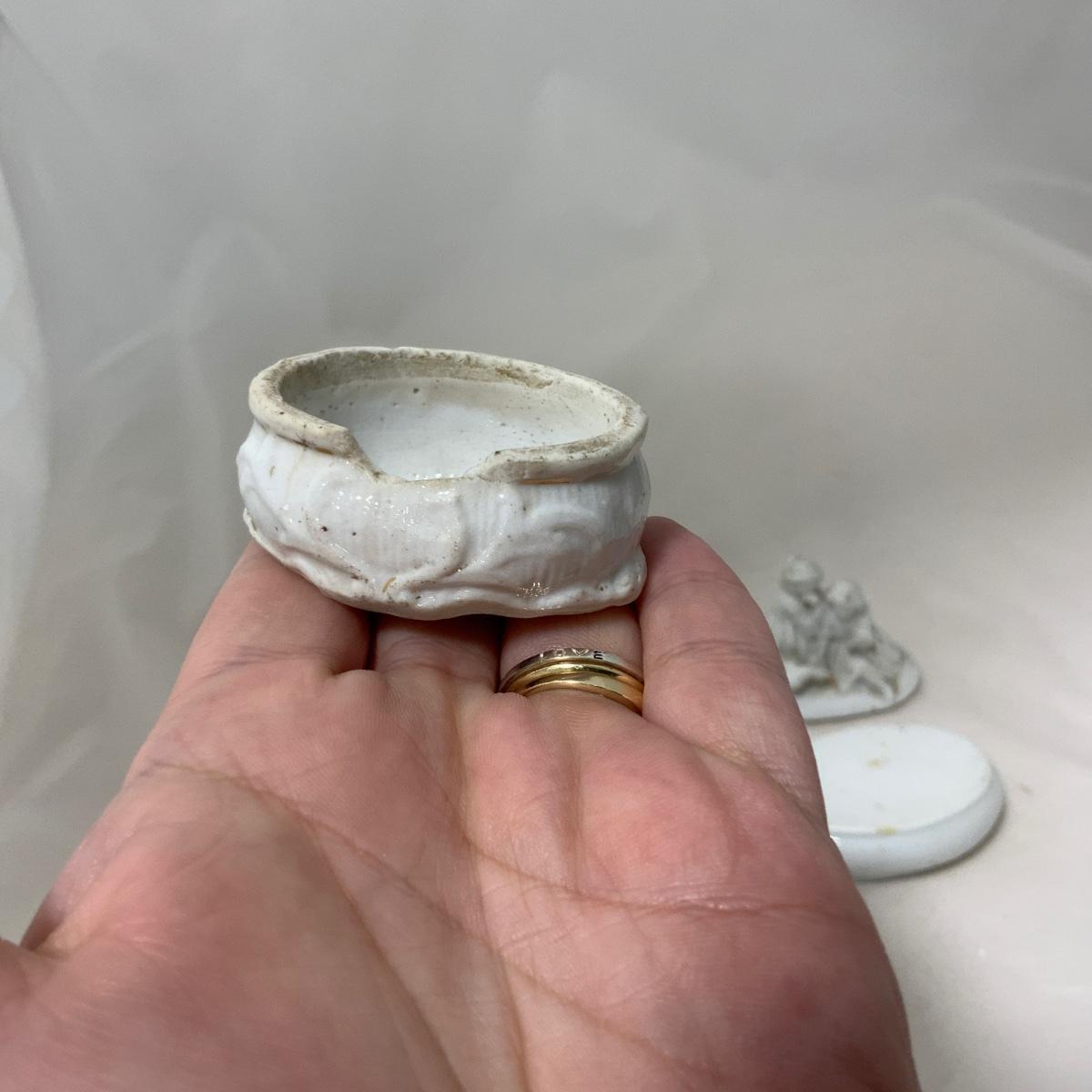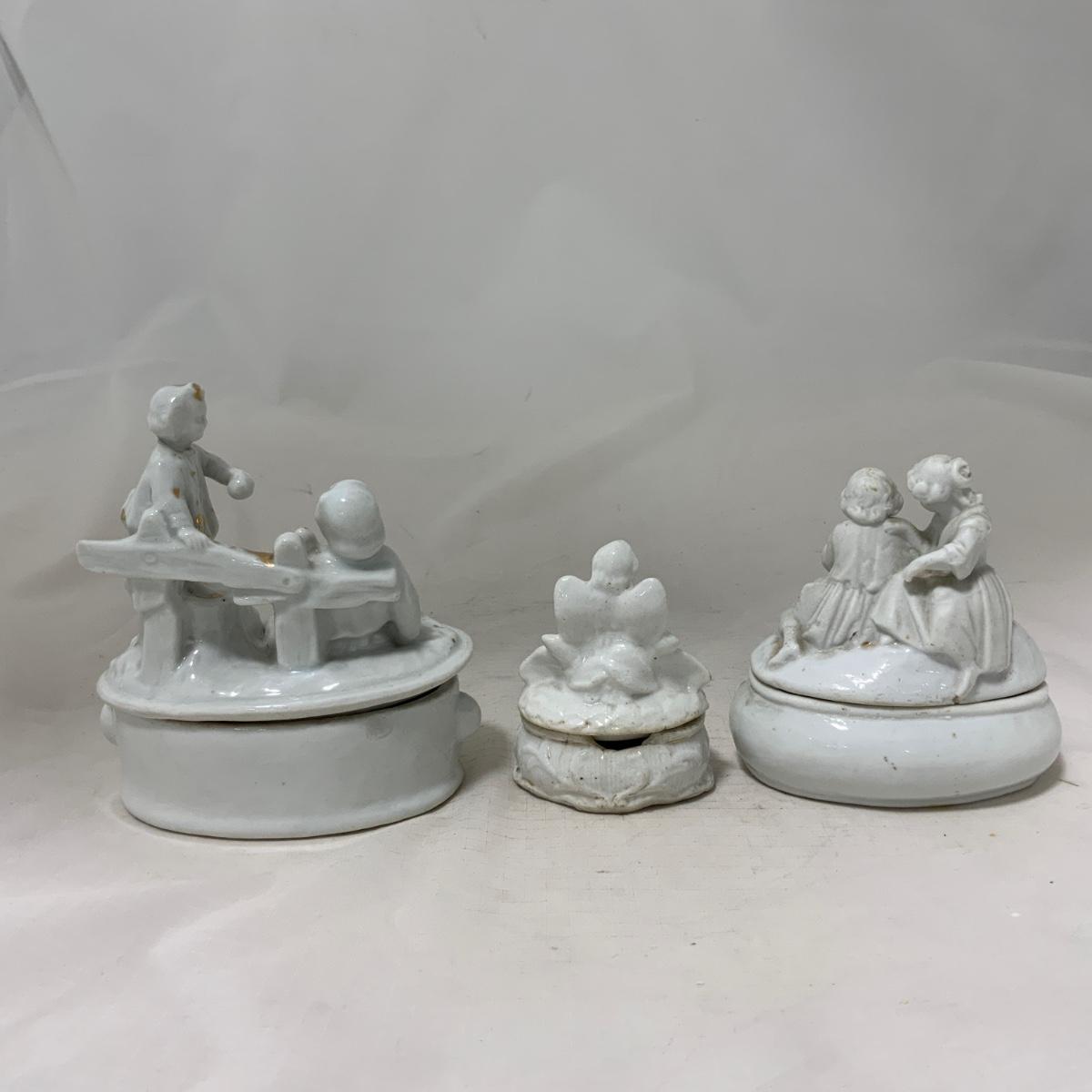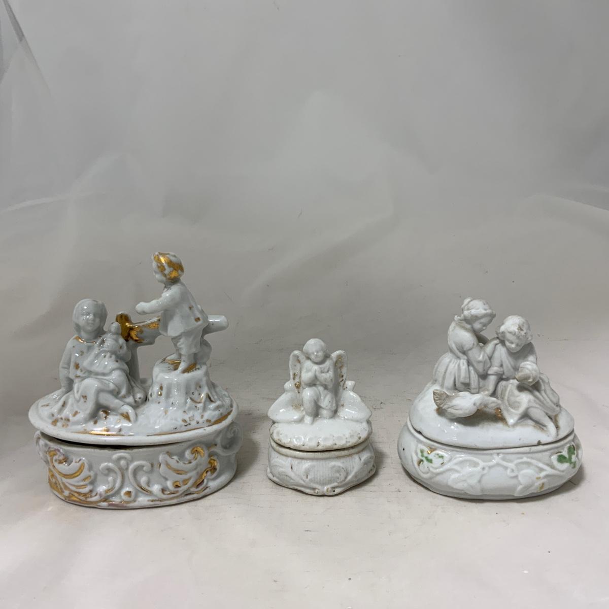Three attractive and unique Porcelain Trinket Boxes. The largest one doesn’t sit perfectly on it’s base, and the smallest angel has a chip out of the base. The medium sized one is just right. Please see photos for details and condition. ::: Shipping is NOT available on this lot. If you have any questions regarding this lot please contact the auctioneer either via this website, by direct email or by phone. PICK UP TIMES and other important information can be found in the TERMS and DESCRIPTION of the auction. Please take a look for pertinent information. Thanks!