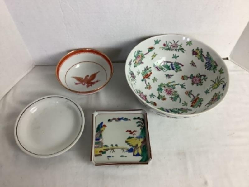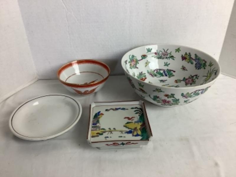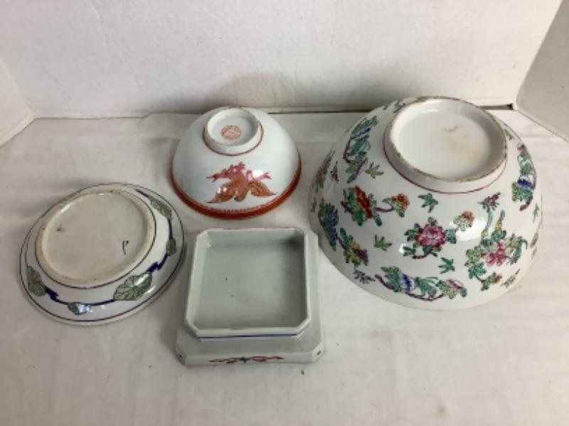 Large bowl measures 10” round and 4-1/2” deep , small bowl measures 6” round and 3” deep. Footed square dish measures 5-1/2”x5-1/2” and 1” high and small plate.