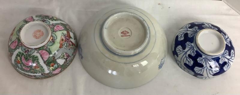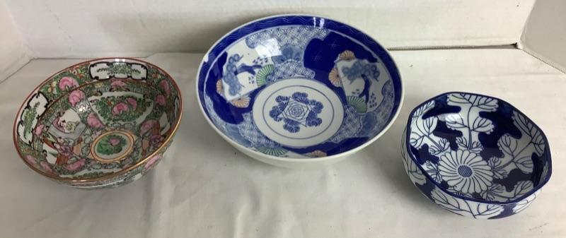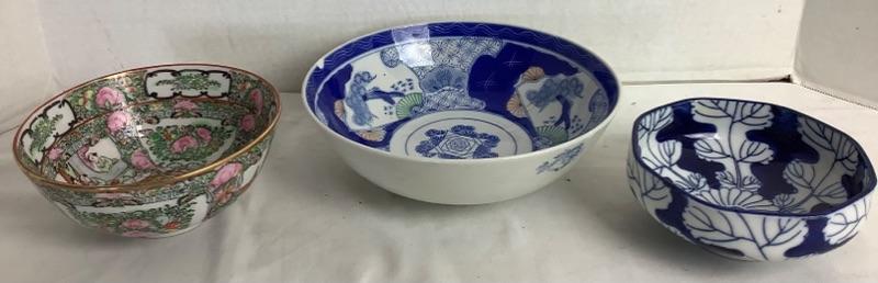 Large blue and white bowl measures 8-1/2” round and 3” deep, small blue and white bowl measures 5-1/2” round and 2-1/2” deep and small bowl measures 6” round and 3” deep
