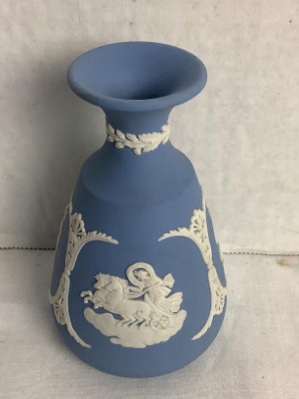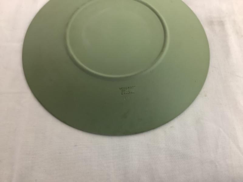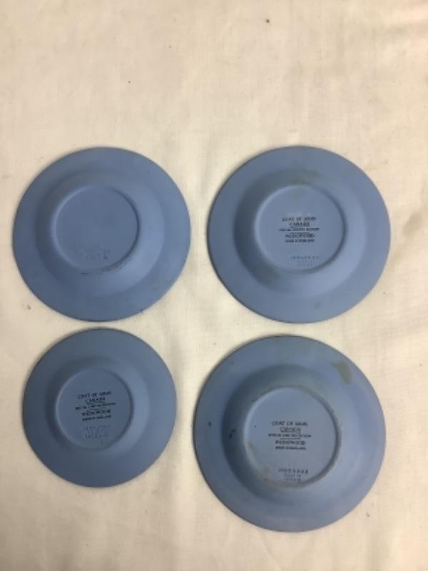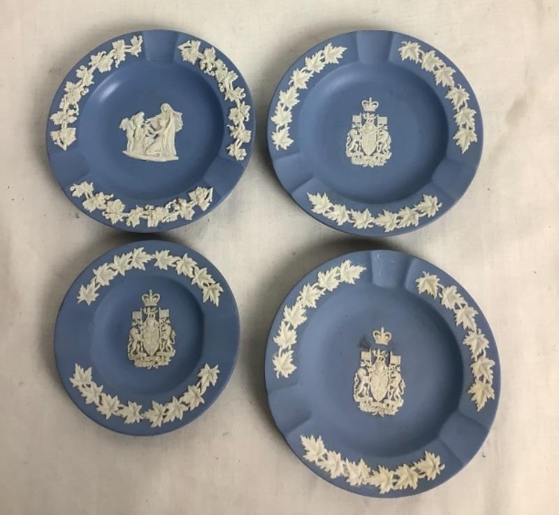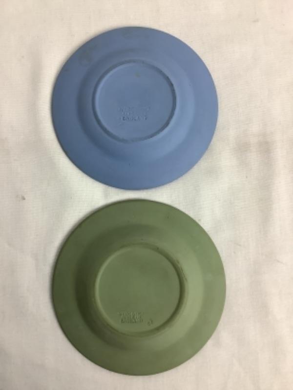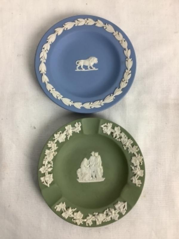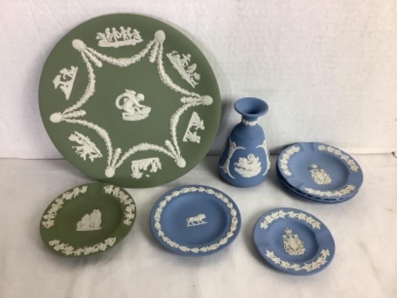 Wedgwood Jasperware Green Plate measuring 9”, Green ashtray measuring 4-1/2”, Blue Bud Vase measuring 5” tall, 2- Blue Canada Coat of Arms ashtrays measuring 4-1/2”, 1 blue ashtray measuring 4-1/2”, 1 Blue plate measuring 4-1/2” and 1 Blue Canada Coat of Arms ashtray measuring 4”