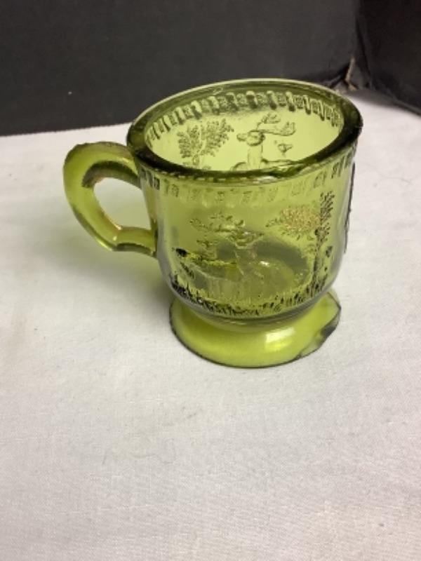 Square vase measures 5” tall and 4-1/2” x 3-1/4”, Tall footed compote measures 7-3/4” tall and 8” x 6”, Short footed compote measures 2-1/4” tall and 4” x 3” and green mug measures 2” tall and 2-1/4” round and has a few chips (see photos)
