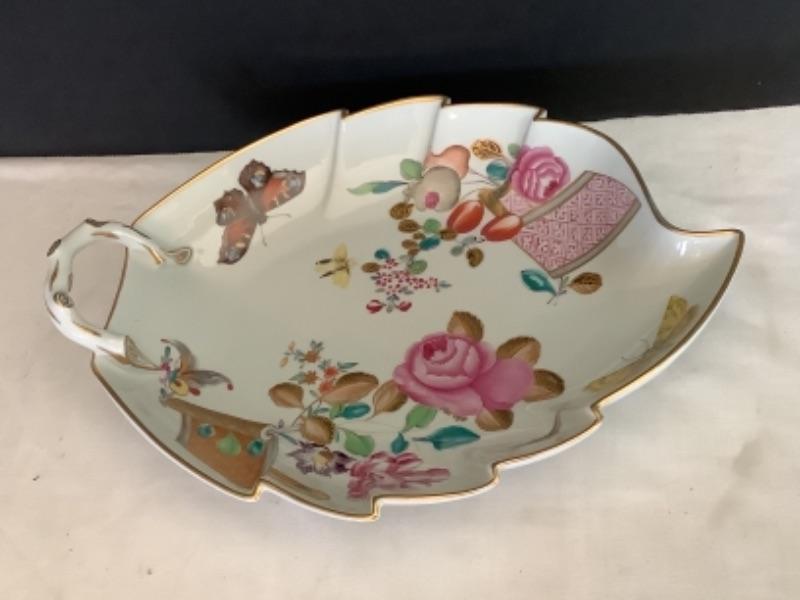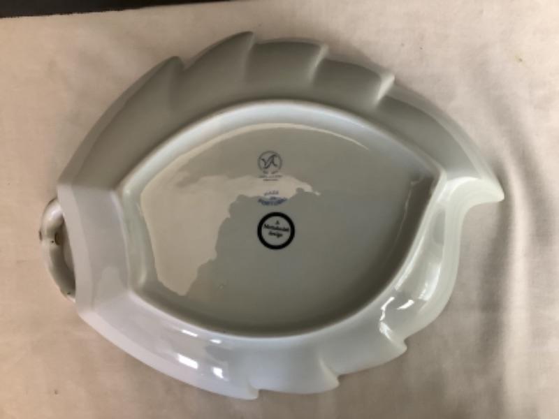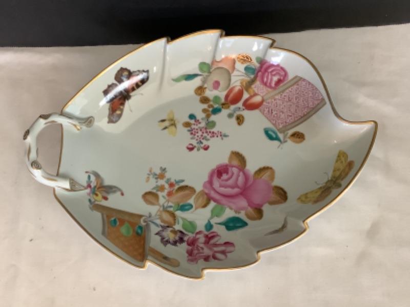 Beautiful Vista Allegra Mottahedah leaf shaped dish. Pattern is Lowestoft Rose. Excellent condition. Measures 11-1/2” long, 8-3/4” wide and 2” deep