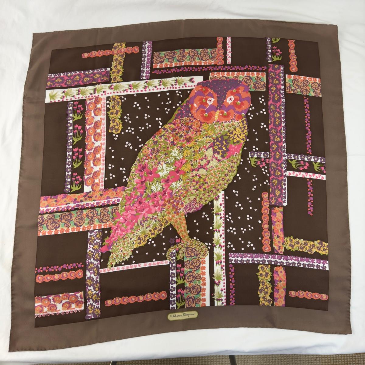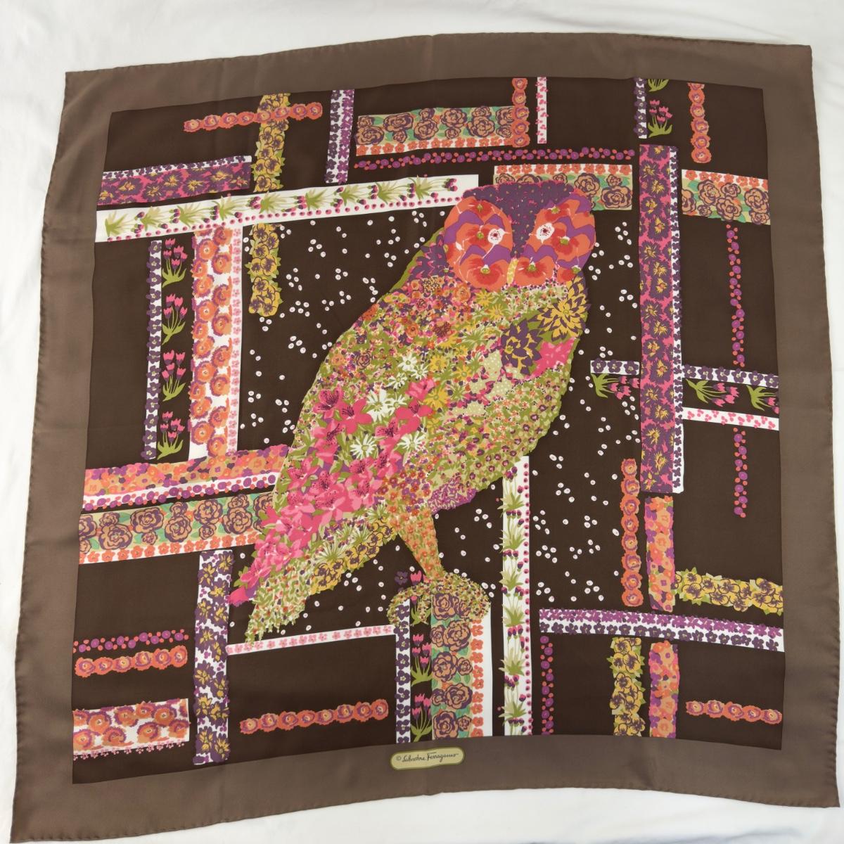 212 Authentic Salvatore Ferragamo Owl & Floral Silk Scarf