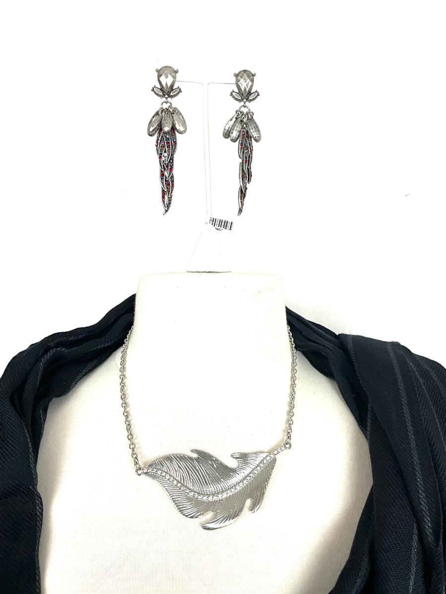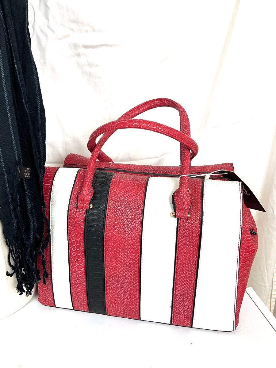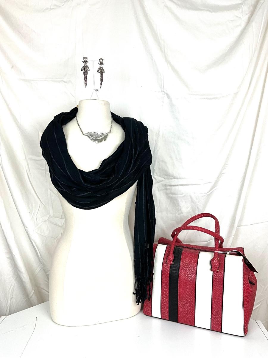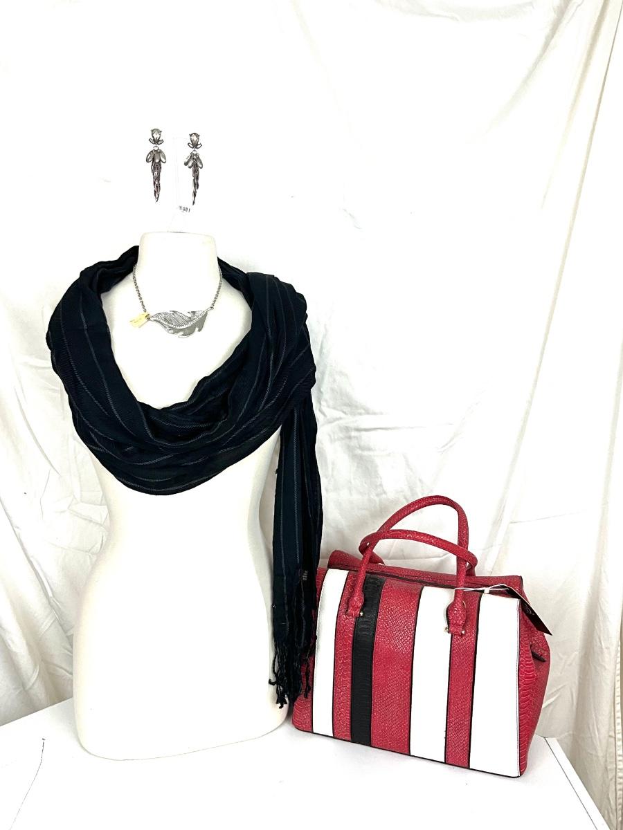 212 Red, White, Black Handbag with Black Knit Scarf, Leaf Rhinestone Necklace and Rhinestone Dangle Earrings