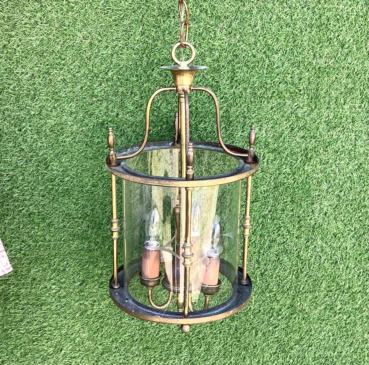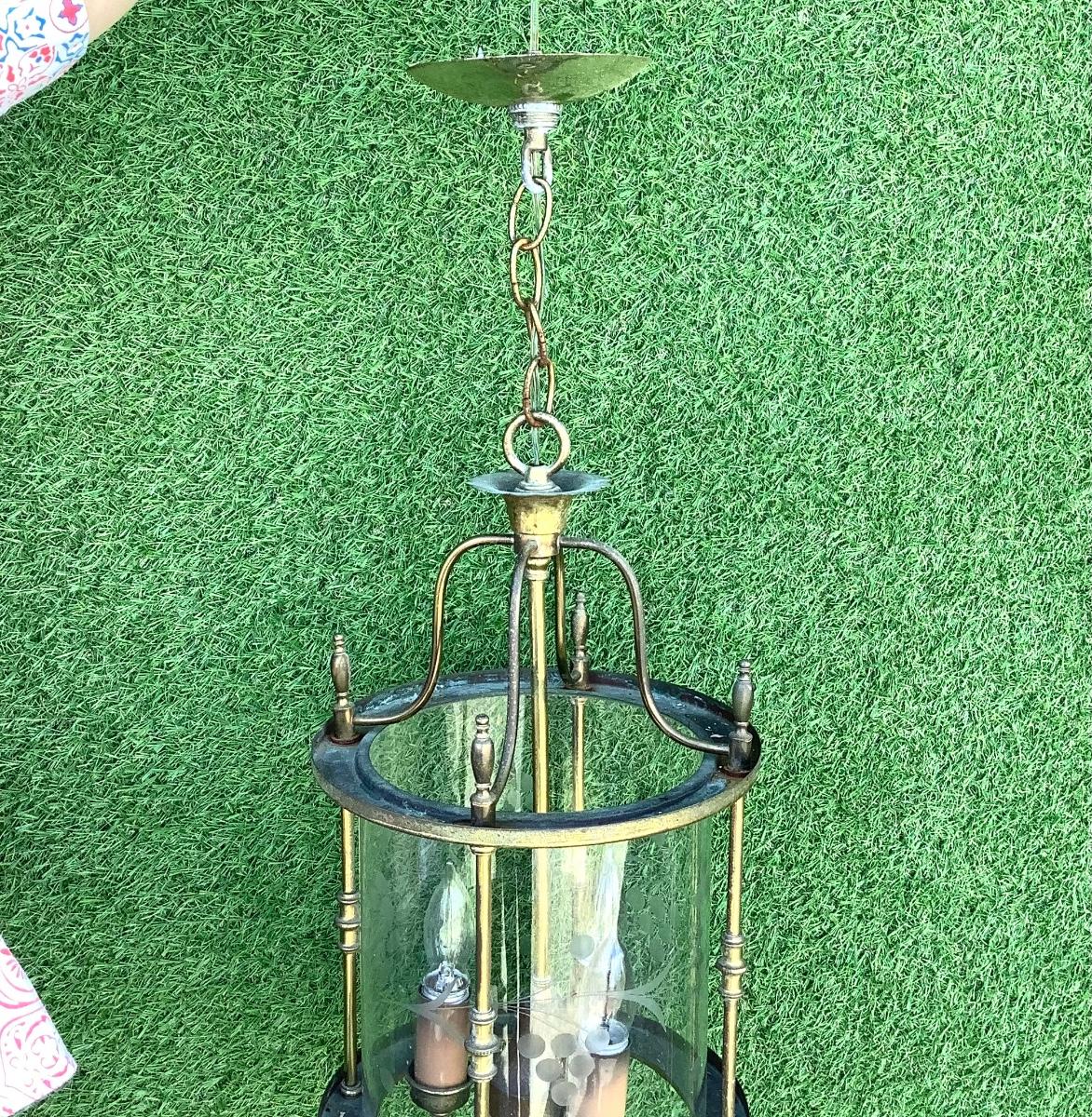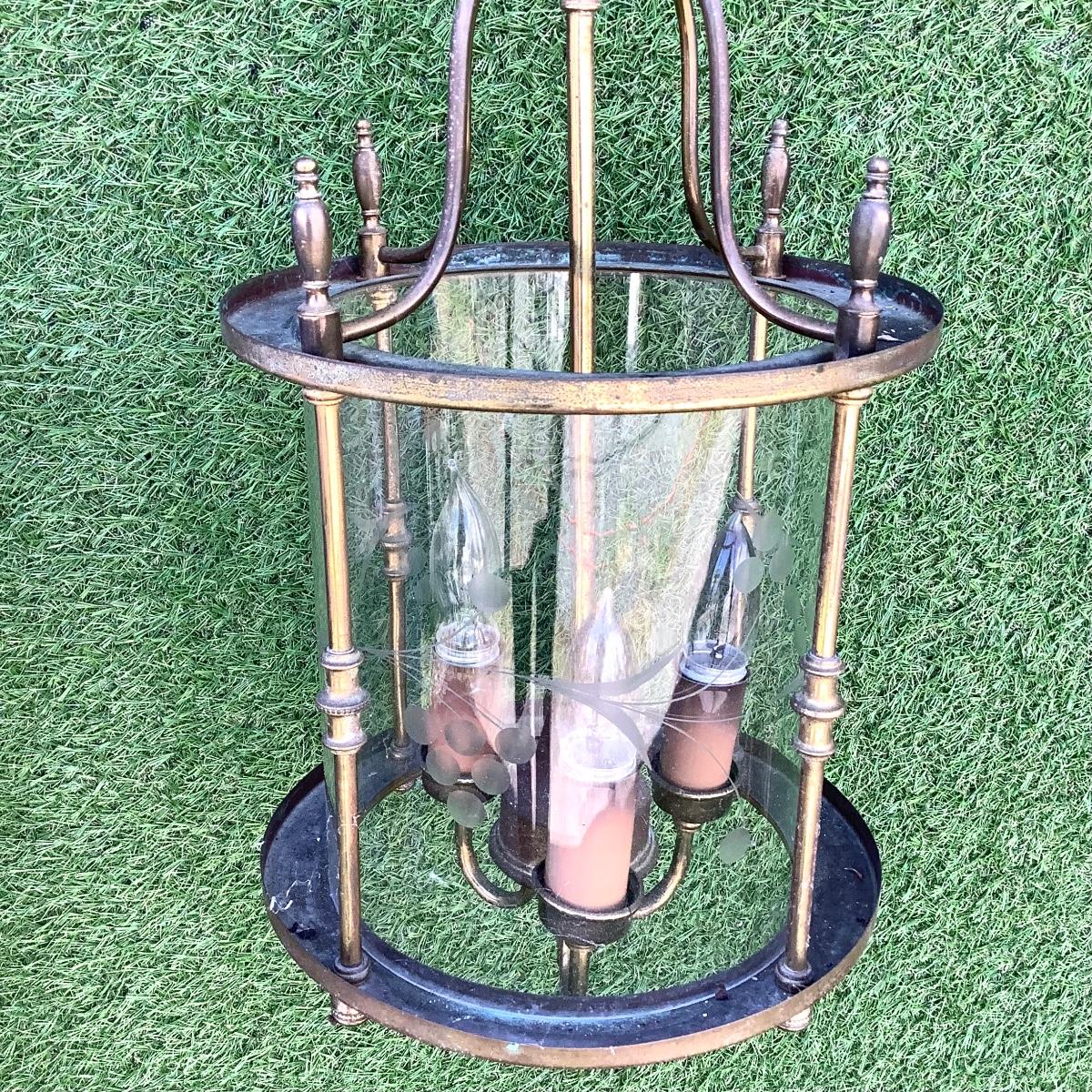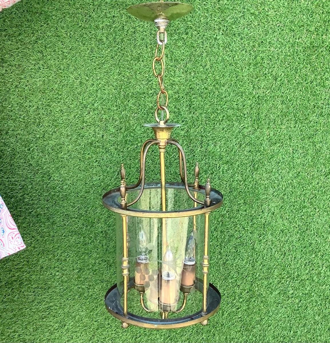 Vintage brass plated circular three arm hall or entry chandelier pendant lamp with etched glass made by Majestic USA in box. Not tested, tarnished, box has damage. Measures 10"Dia., 26"H including chain and brass plated ceiling canopy.