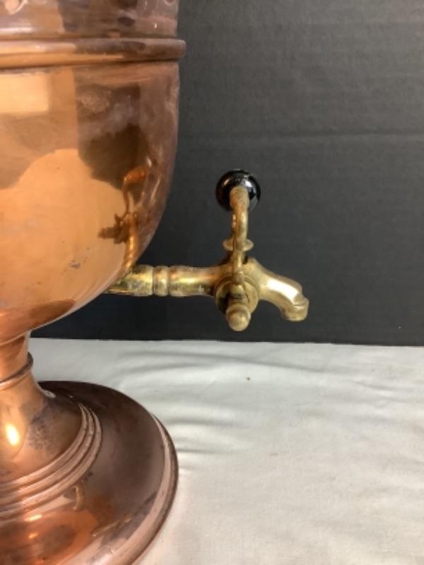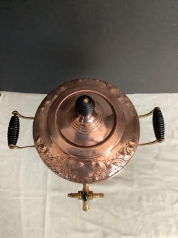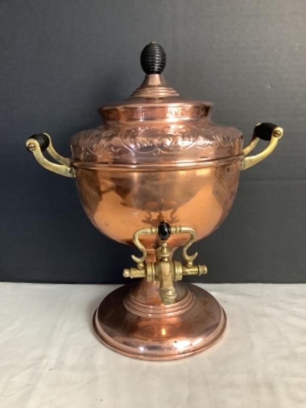 Copper Samavoir with brass handles and spigot. Measures 14-1/2” tall and 11” from handle to handle. HAs some wear and inside needs a good cleaning (see photos) but, all in all a beautiful piece!