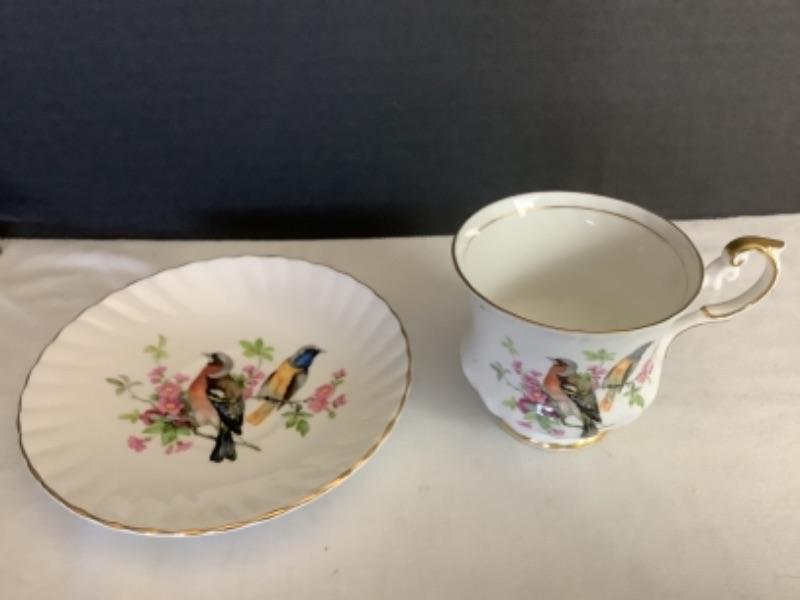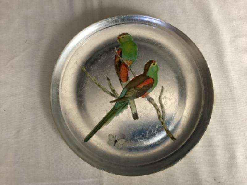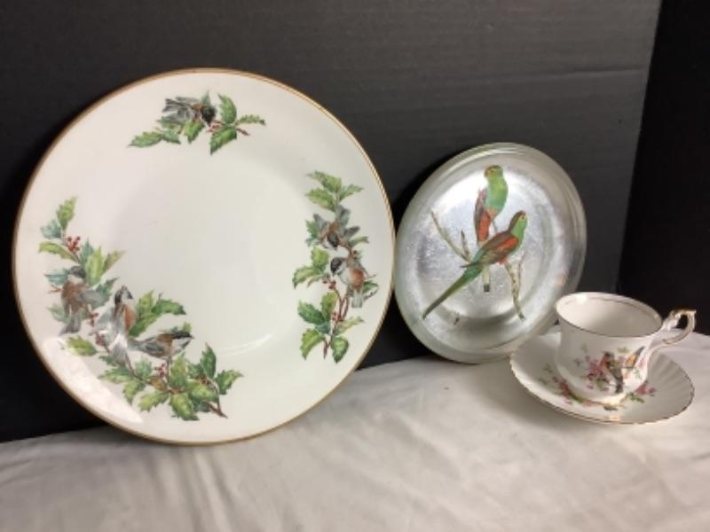 Boehm Plate is in like new condition and measures 10-3/4” round, Rosina bone china demitasse cup and saucer in excellent condition and Glass decorative bird plate measures 8”