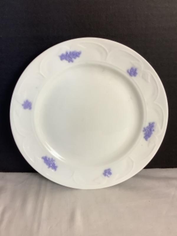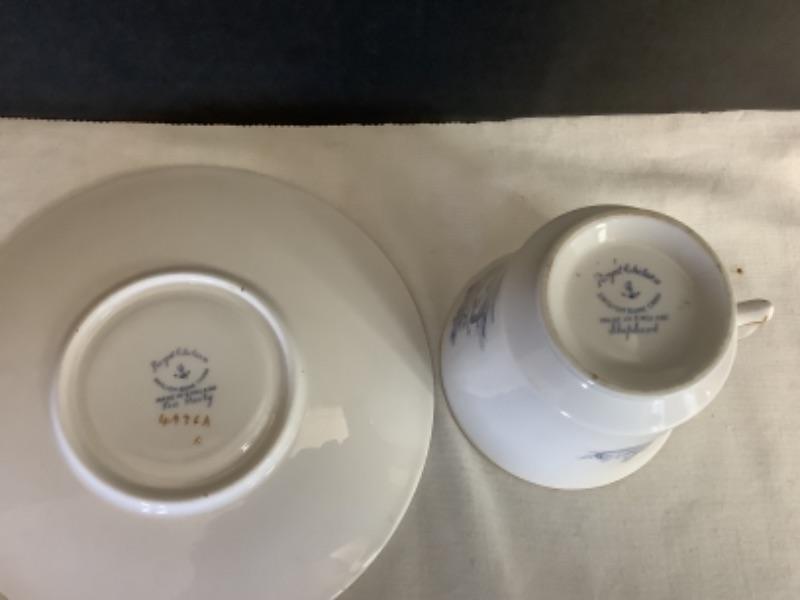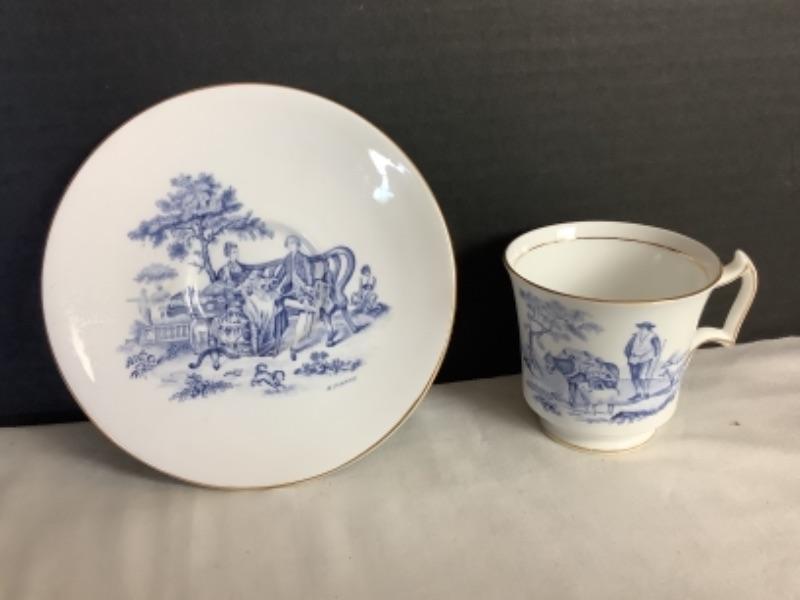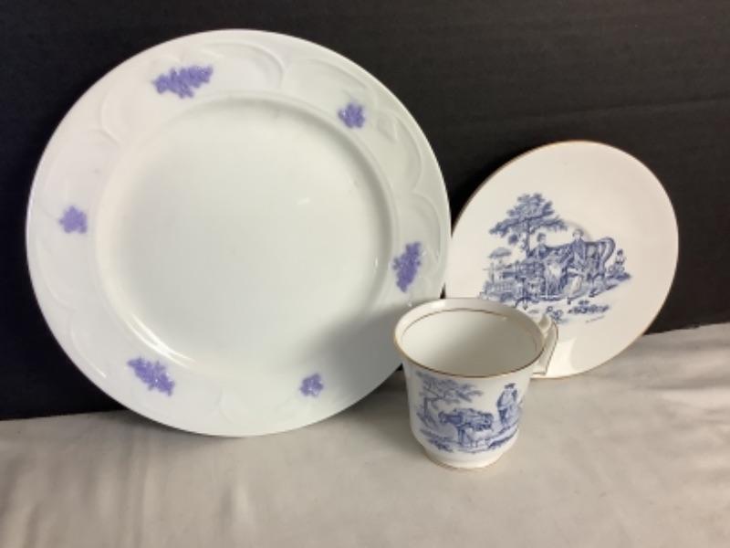 Adderley Blue Chelsea 9” Grape Bunch plate in excellent condition, Royal Chelsea “Shepherd” demitasse cup and Royal Chelsea “Tea Party” saucer both in excellent condition