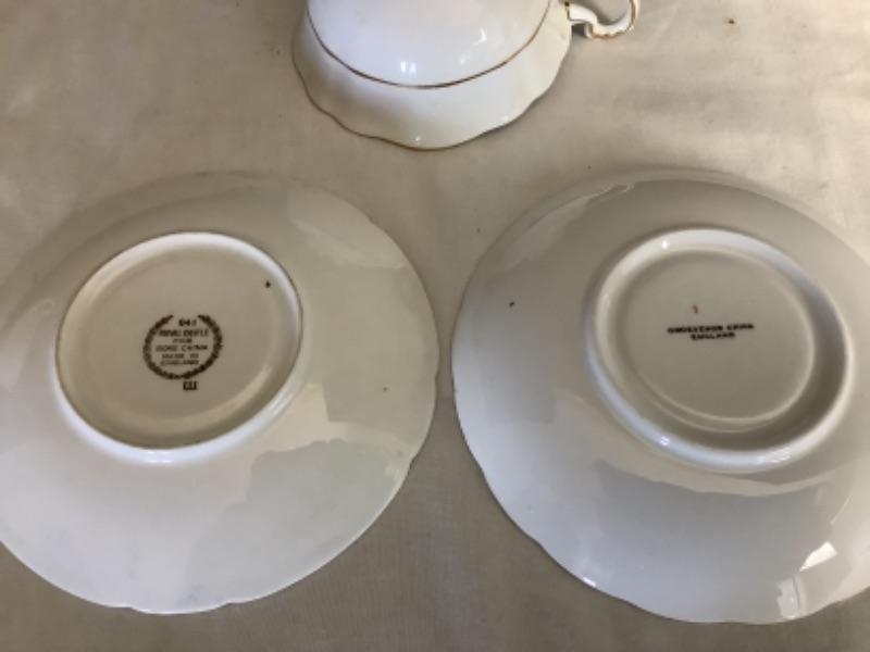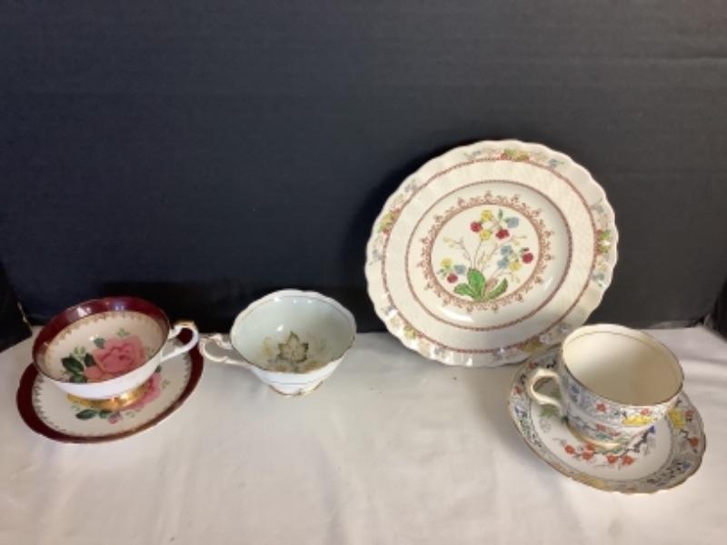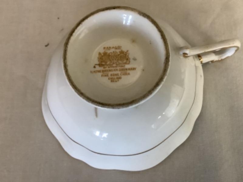 Copeland Spode “Spode’s Cowslip” plate measures 8” and has a chip on the rim (see photos), Paragon Bone China demitasse cup, Royal Castle Bone China demitasse cup and saucer and Grosvenor China demitasse cup and saucer