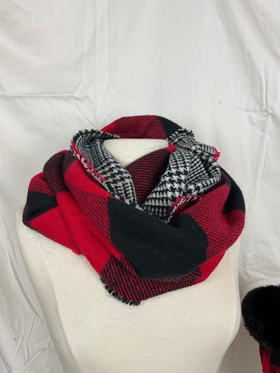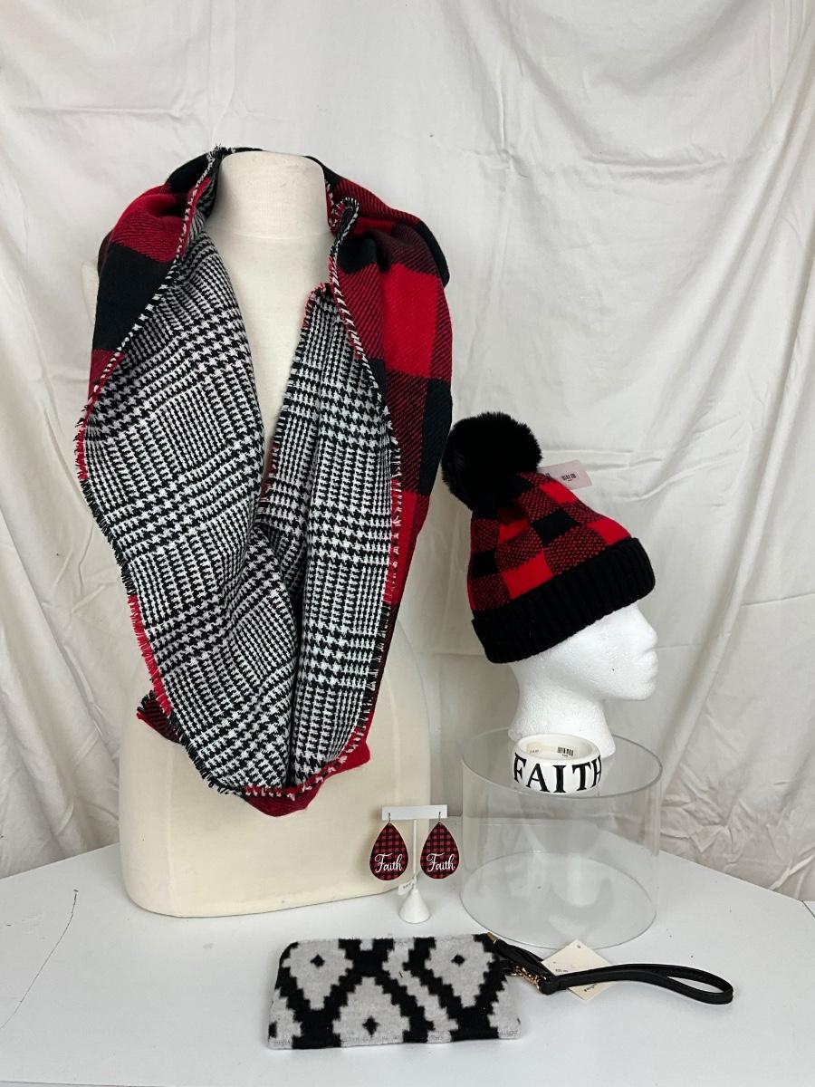 213 Buffalo Plaid Ininity Scarf with Pom Pom Ball Hat with Earrings and Faith Bangle Bracelet
