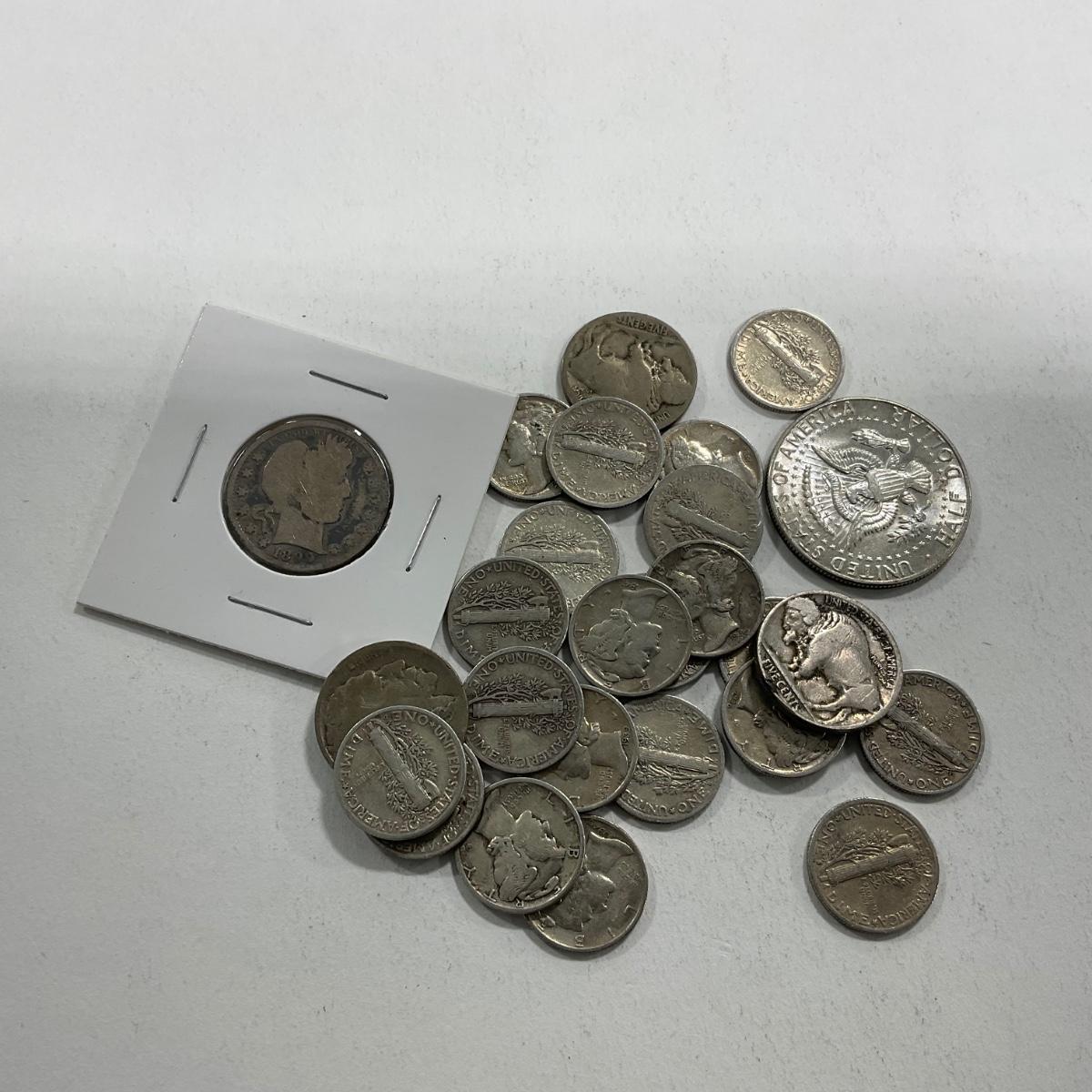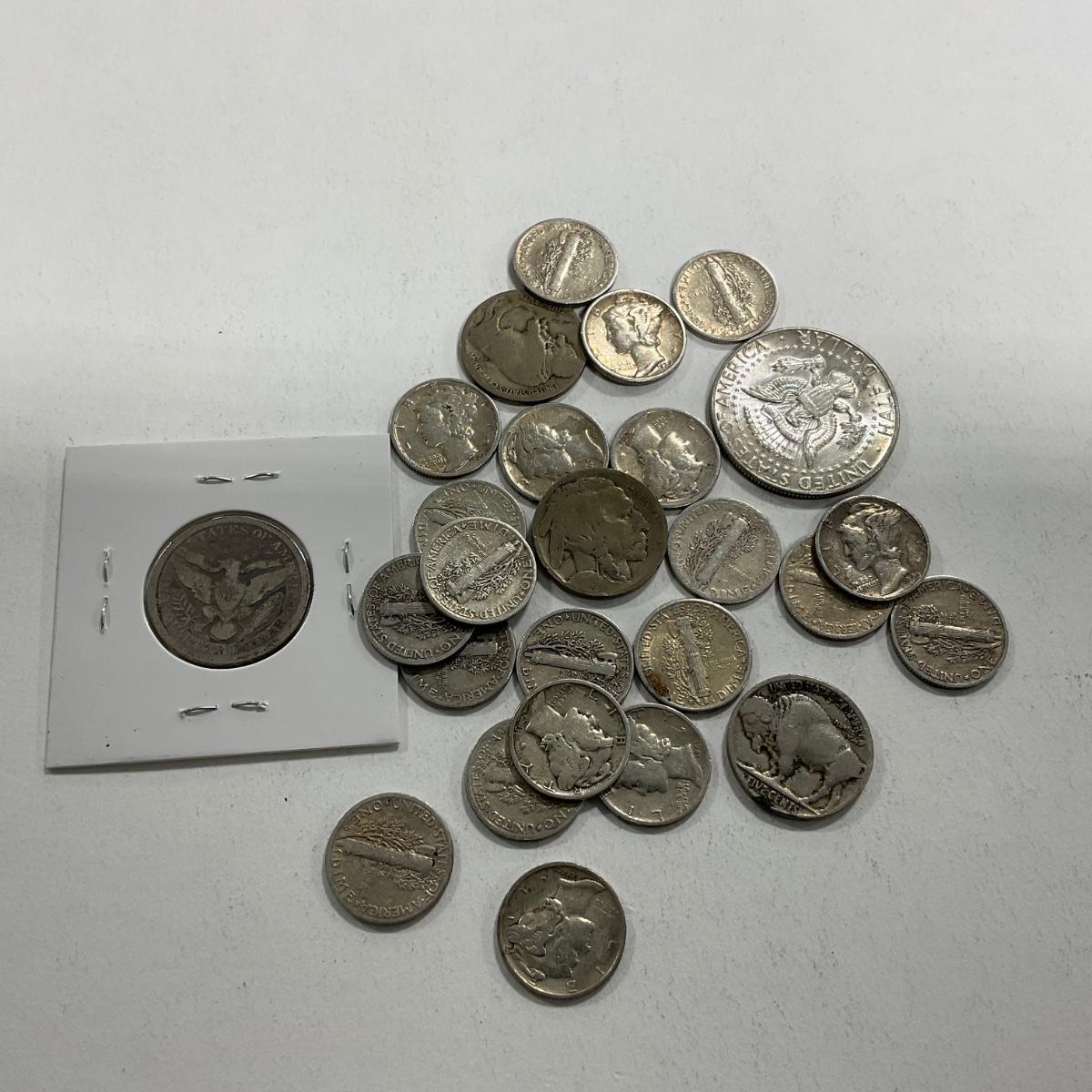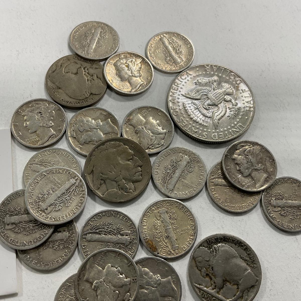 Silver junk drawer lot $2.10 of 90% mercury dimes, one 40% silver Kennedy, a couple no date Buffalos 1899 barber. Please see photos for details and condition. ::: Shipping is available on this lot. If you require shipping you must let us know at the close of the auction. We will coordinate with you after the item has been won. Shipping fees will include insurance up to or exceeding the value of all items being mailed. If you have any questions regarding this lot please contact the auctioneer either via this website, by direct email or by phone. PICK UP TIMES and other important information can be found in the TERMS and DESCRIPTION of the auction. Please take a look for pertinent information. Thanks!