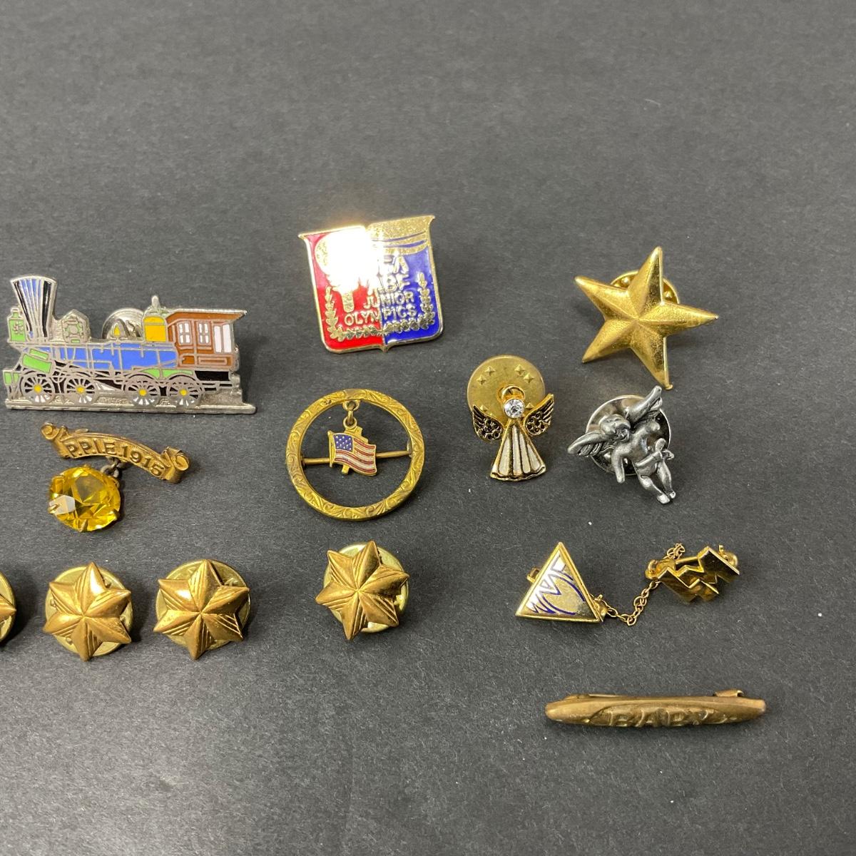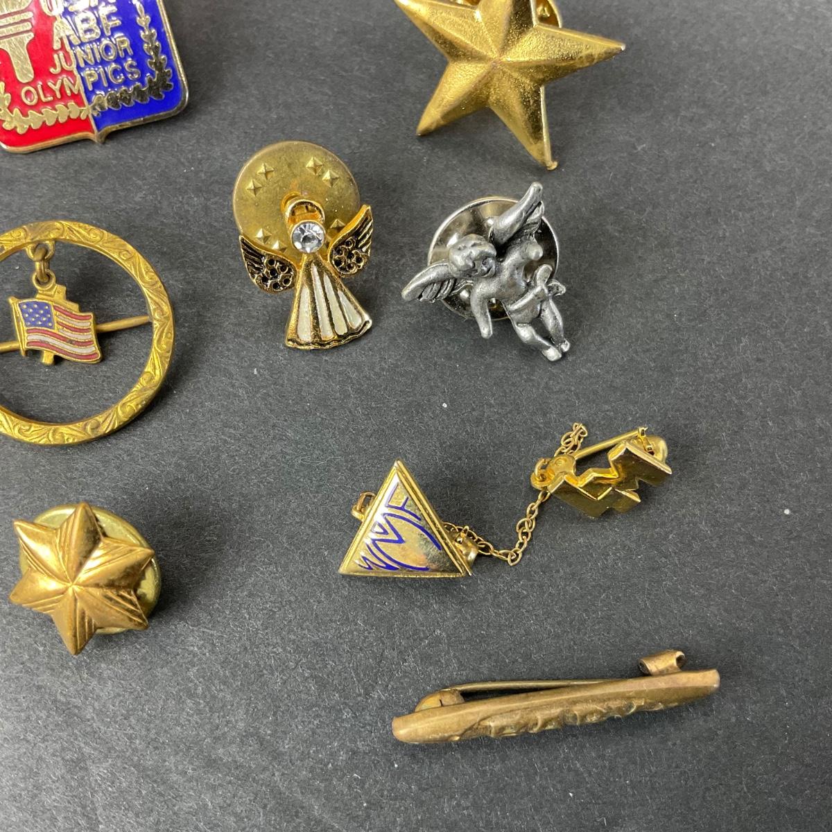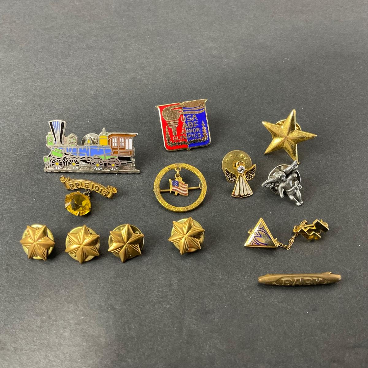 Lot of miscellaneous assortment of pins. Please see photos for details and condition. Any condition statement is given as a courtesy to a client, is an opinion, and should not be treated as a statement of fact. Reference to condition written, oral or within a condition report shall not be regarded as a full account of condition and may not include all defects, alterations, or restorations. Absence of a condition report does not imply a lot is flawless or lacking imperfections or damage. Katherine’s Auction & Appraisal Service shall have no responsibility for any error or omission. Returns shall not be accepted on the basis of condition. ::: Shipping is available on this lot. If you require shipping you must let us know at the close of the auction. We will coordinate with you after the item has been won. Shipping fees will include insurance up to or exceeding the value of all items being mailed. If you have any questions regarding this lot please contact the auctioneer either via this website, by direct email or by phone. PICK UP TIMES and other important information can be found in the TERMS and DESCRIPTION of the auction. Please take a look for pertinent information. Thanks!