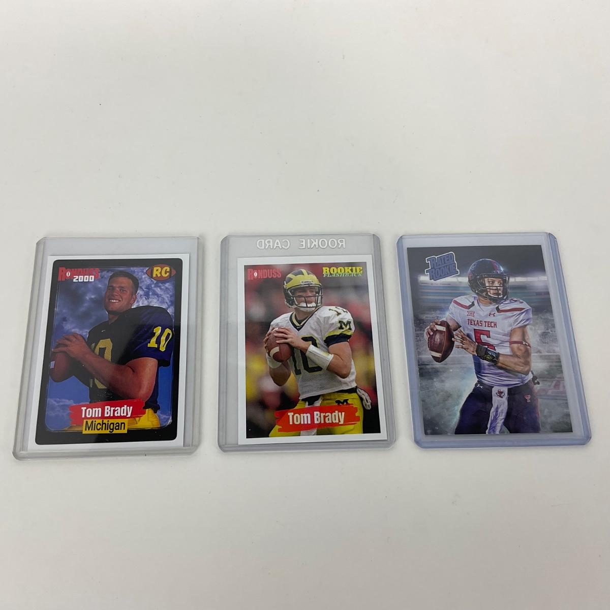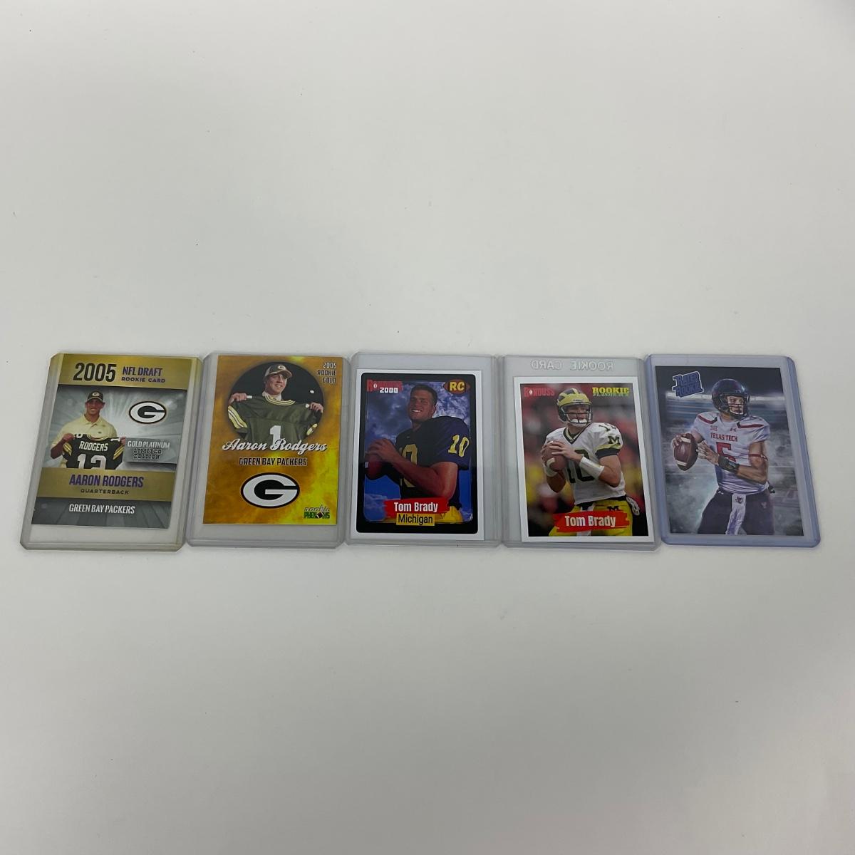 Five football quarterback greats rookie cards in plastic sleeves. Please see photos for details and condition. ::: Shipping is available on this lot. If you require shipping you must let us know at the close of the auction. We will coordinate with you after the item has been won. Shipping fees will include insurance up to or exceeding the value of all items being mailed. If you have any questions regarding this lot please contact the auctioneer either via this website, by direct email or by phone. PICK UP TIMES and other important information can be found in the TERMS and DESCRIPTION of the auction. Please take a look for pertinent information. Thanks!