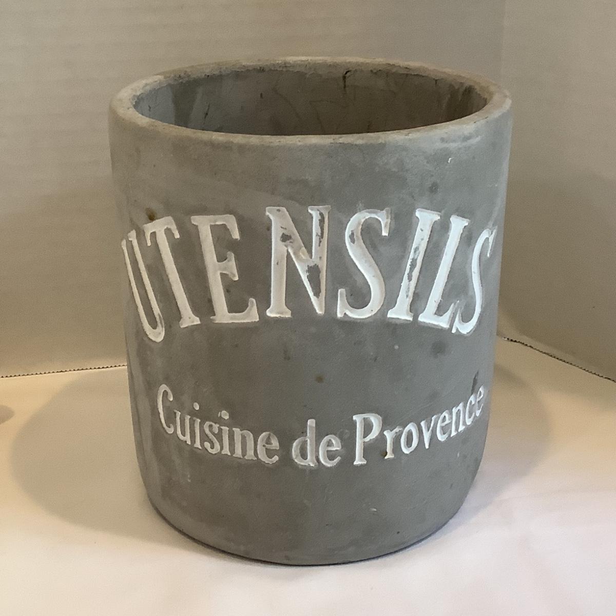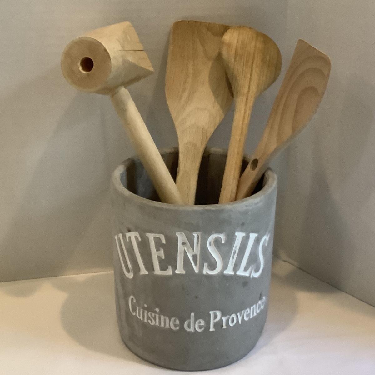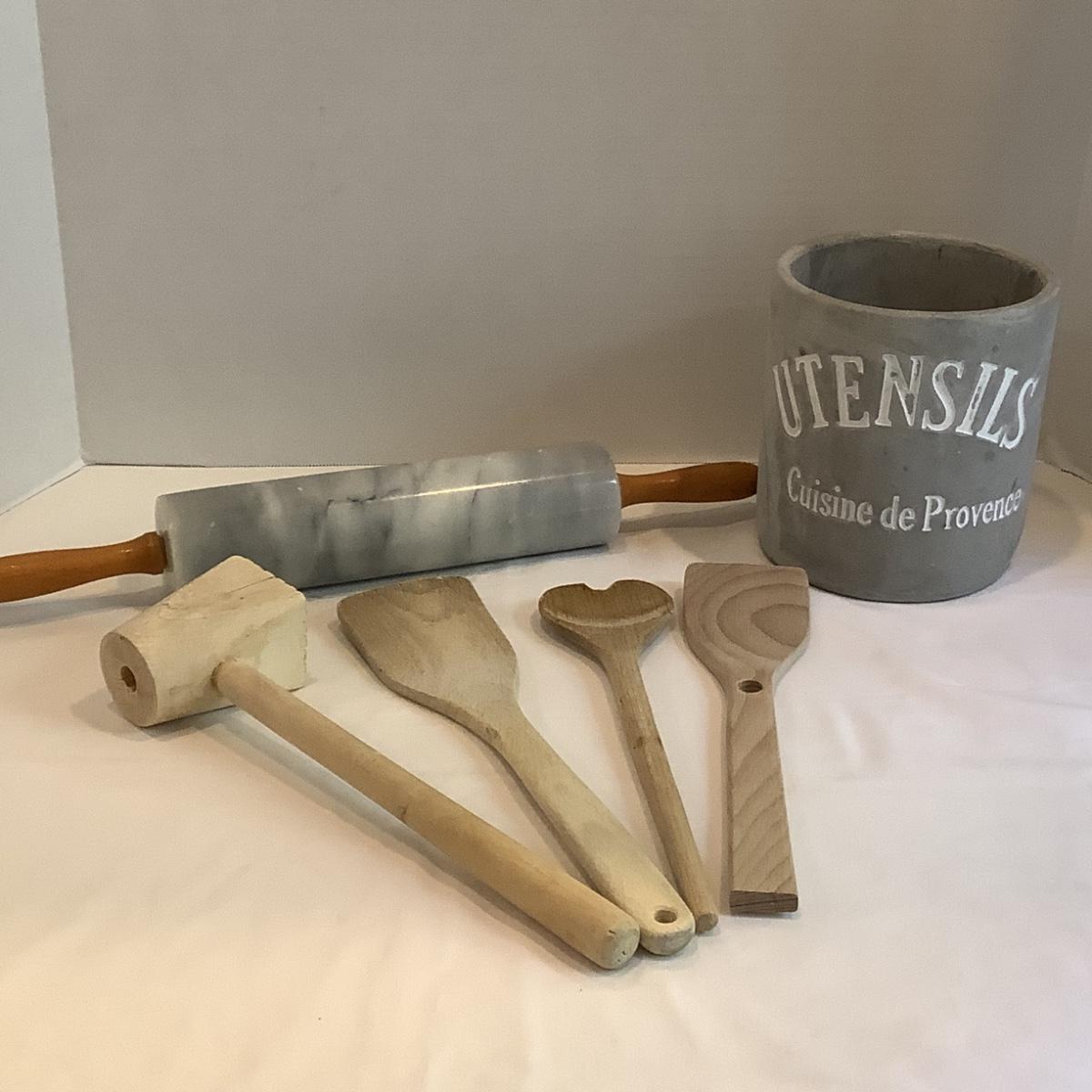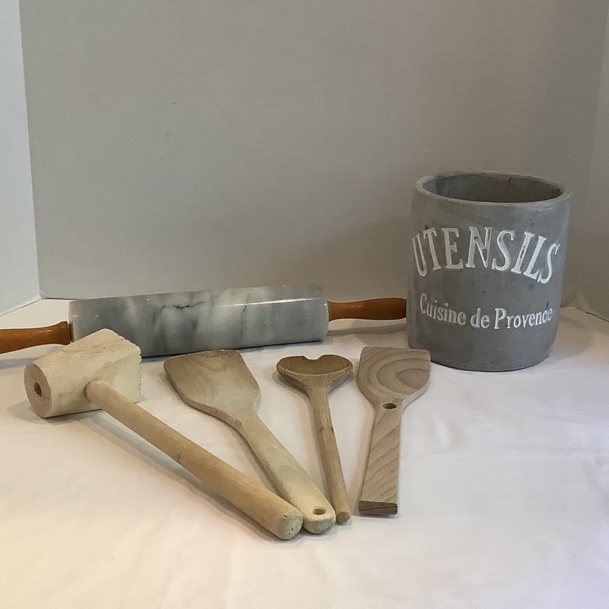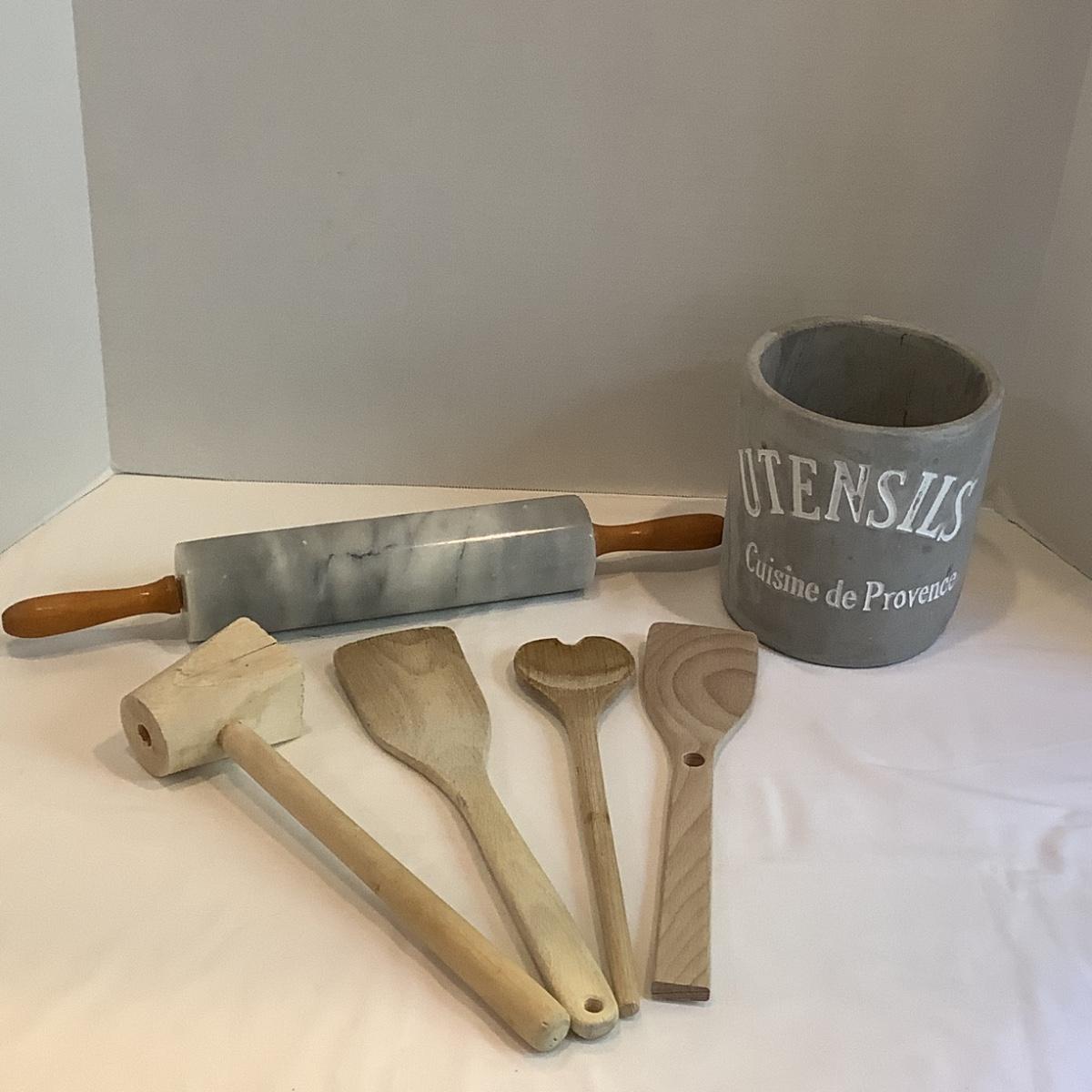 Good Condition French style Stone Utensil Holder , with wooden utensils, and marble rolling pin