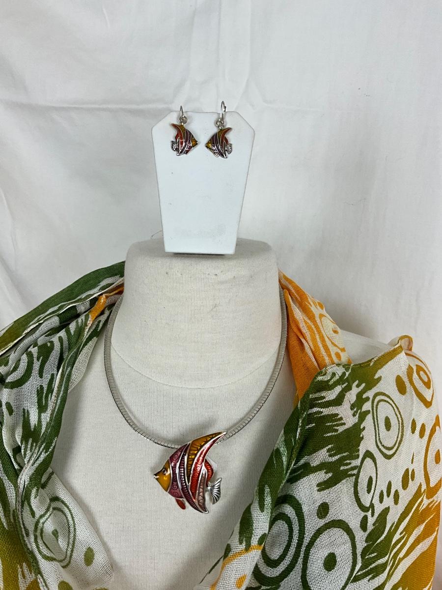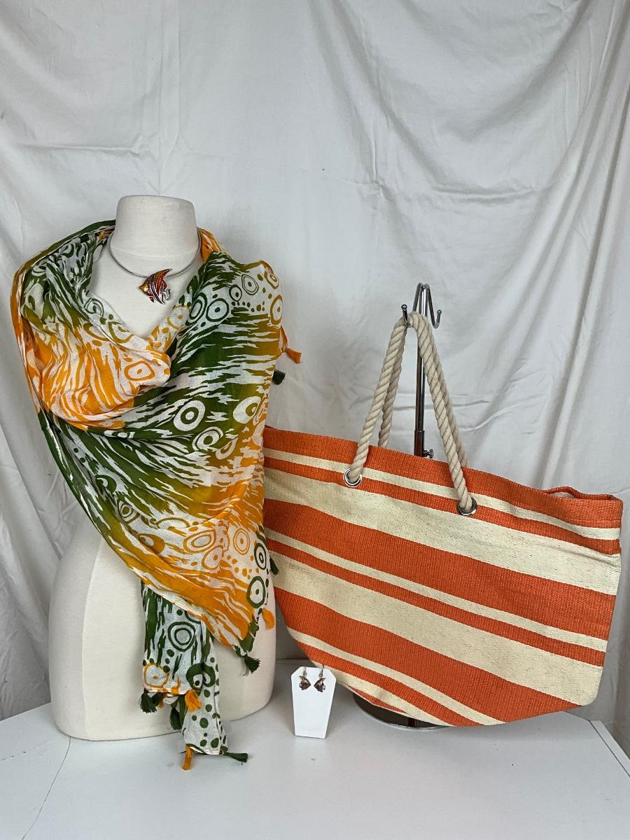 214 Green, White, Orange Shawl/Wrap with Orange and White Beach Bag , Fish Enamel Earrings and Necklace/Pendant