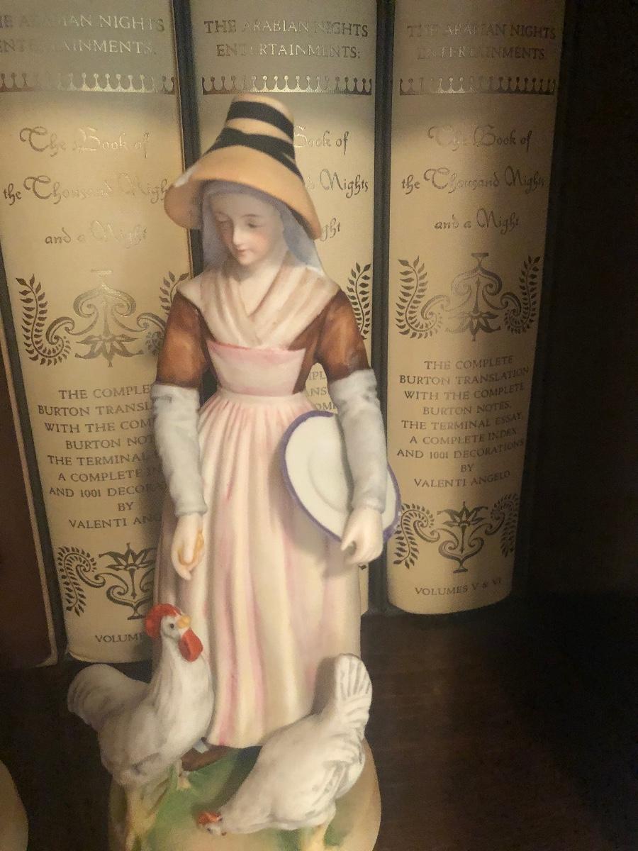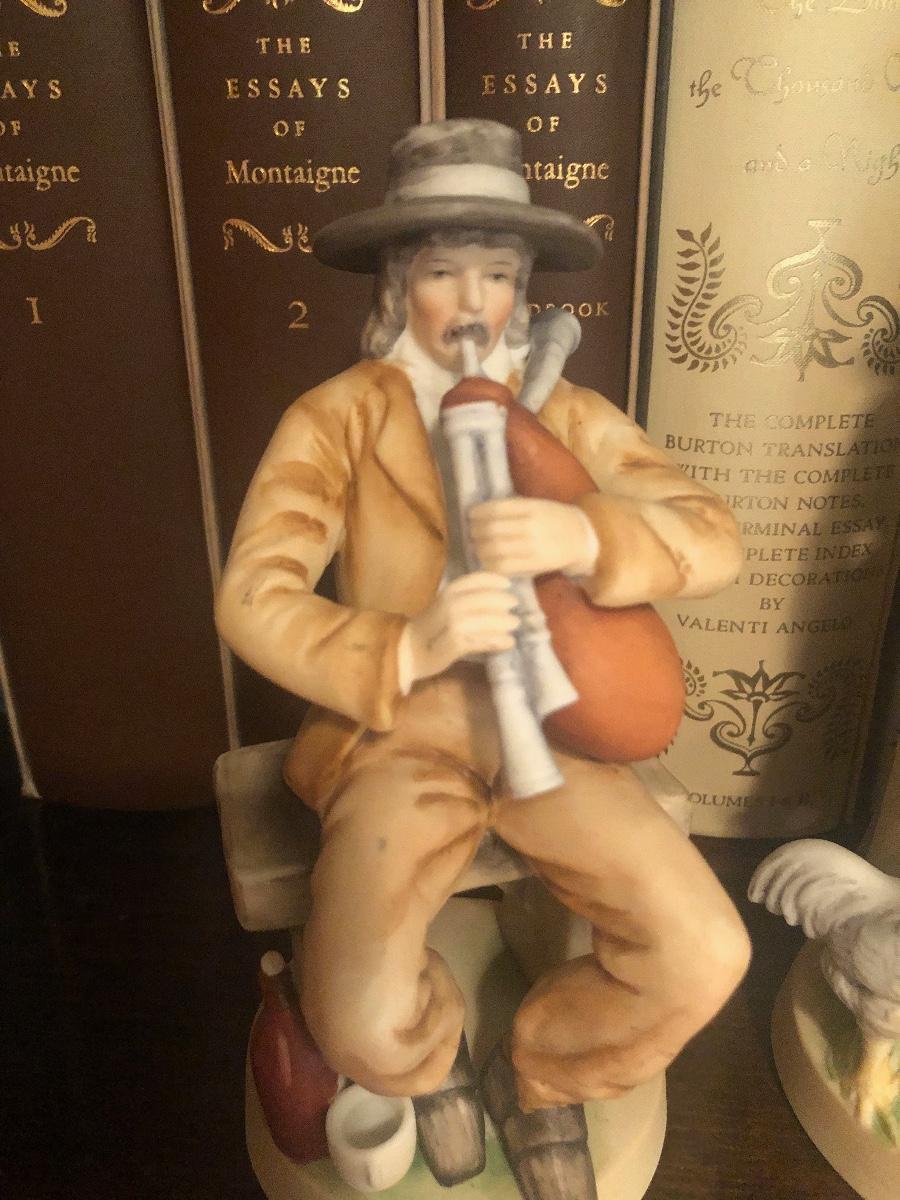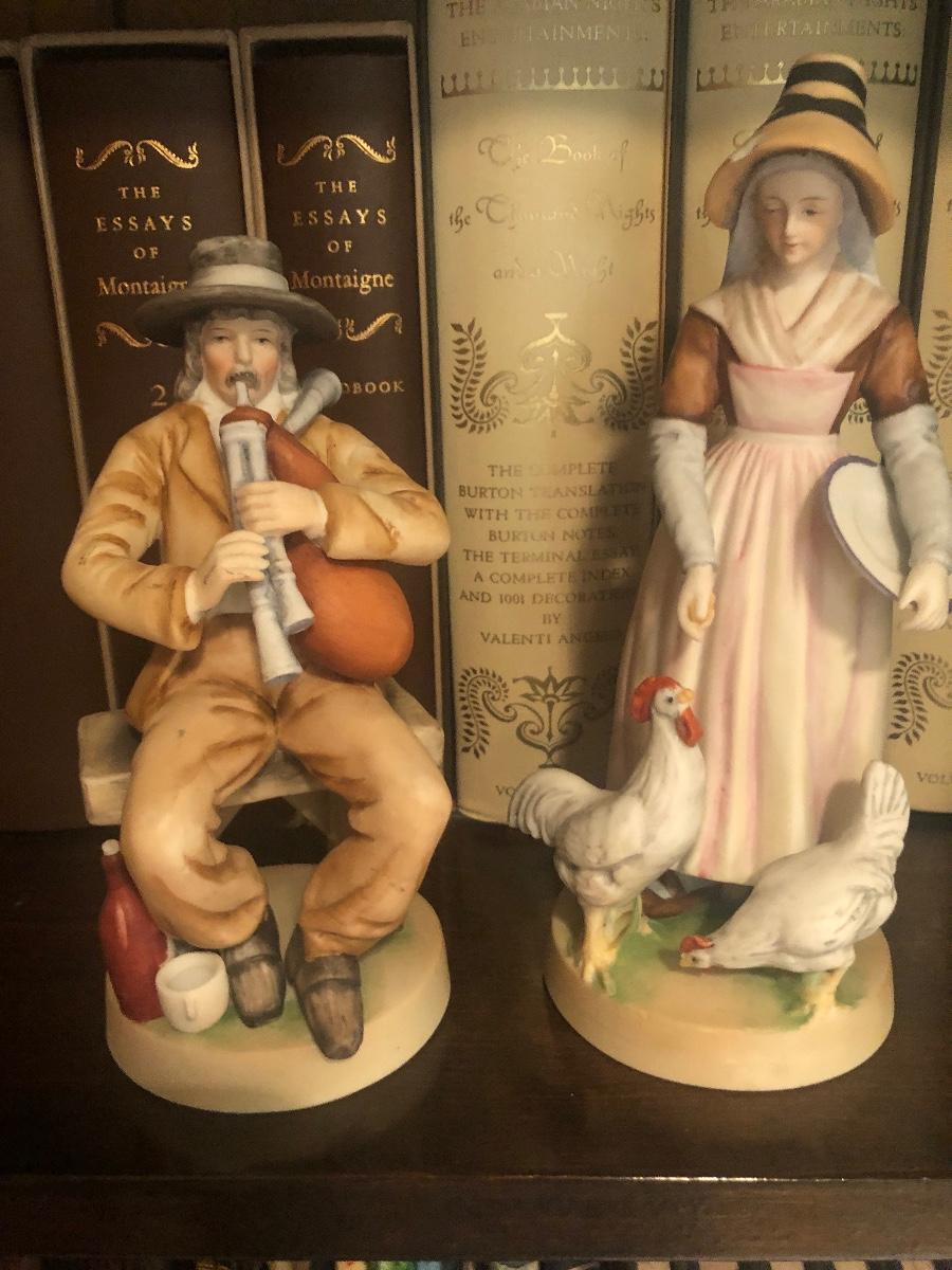 #214 porcelain figurines woman feeding chickens man playing bagpipes