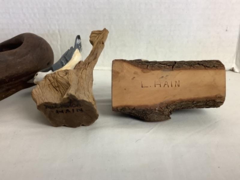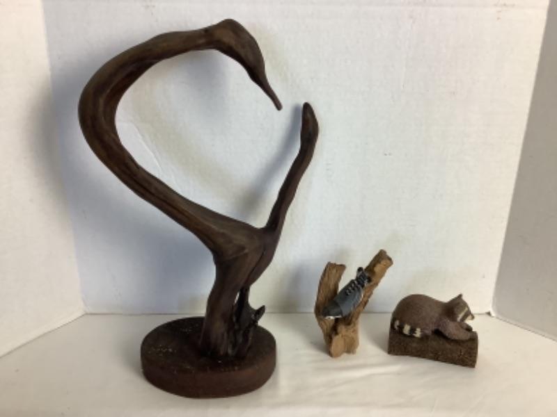 Abstract Driftwood Sculpture measures approximately 17’ high carved signature on bottom L. Hain, Small White Breasted Nuthatch on Driftwood measures approximately 5-1/2” high and Small Raccoon on A Log carving measures approximately 3-1/4” high and 4-1/2” wide signed L. Hain on bottom