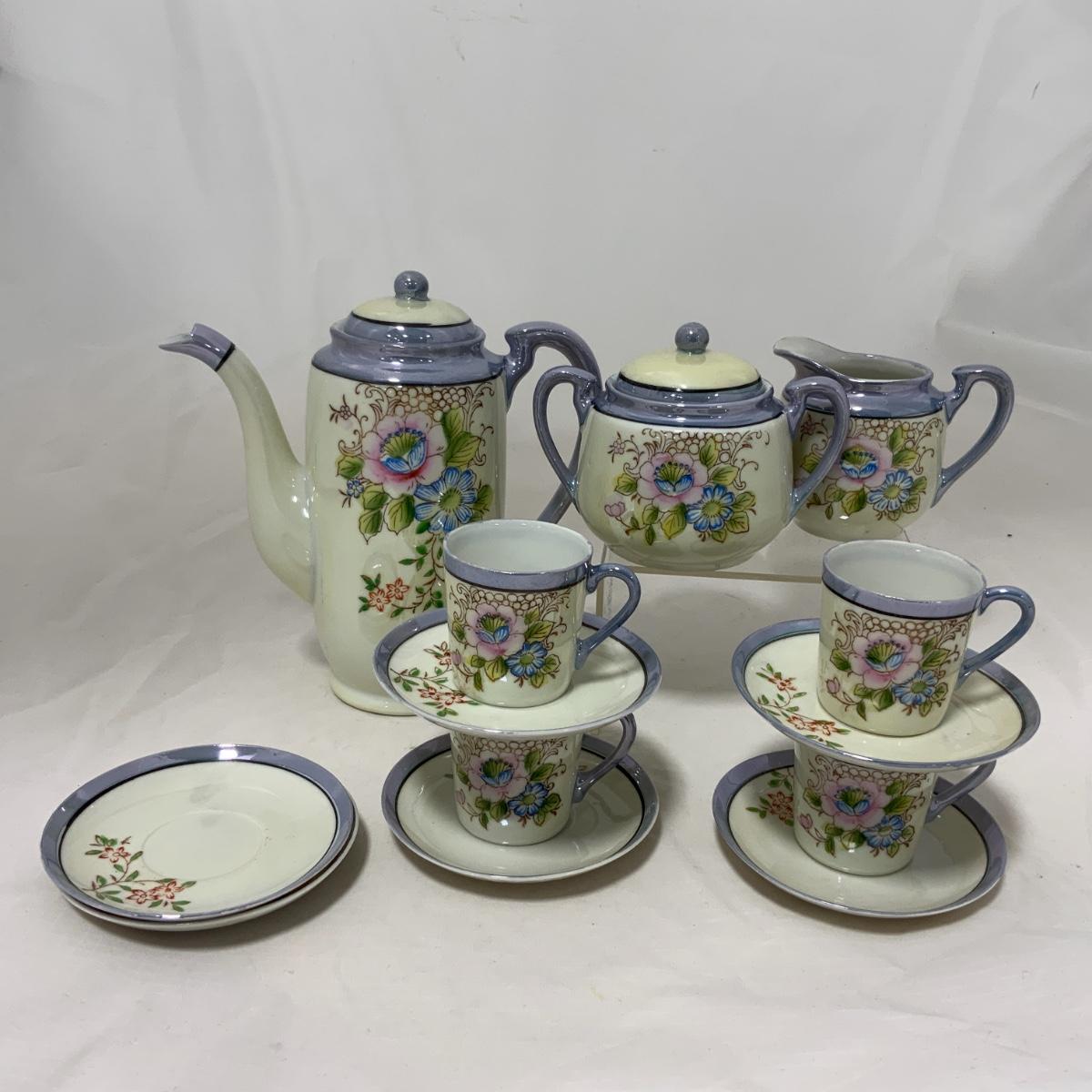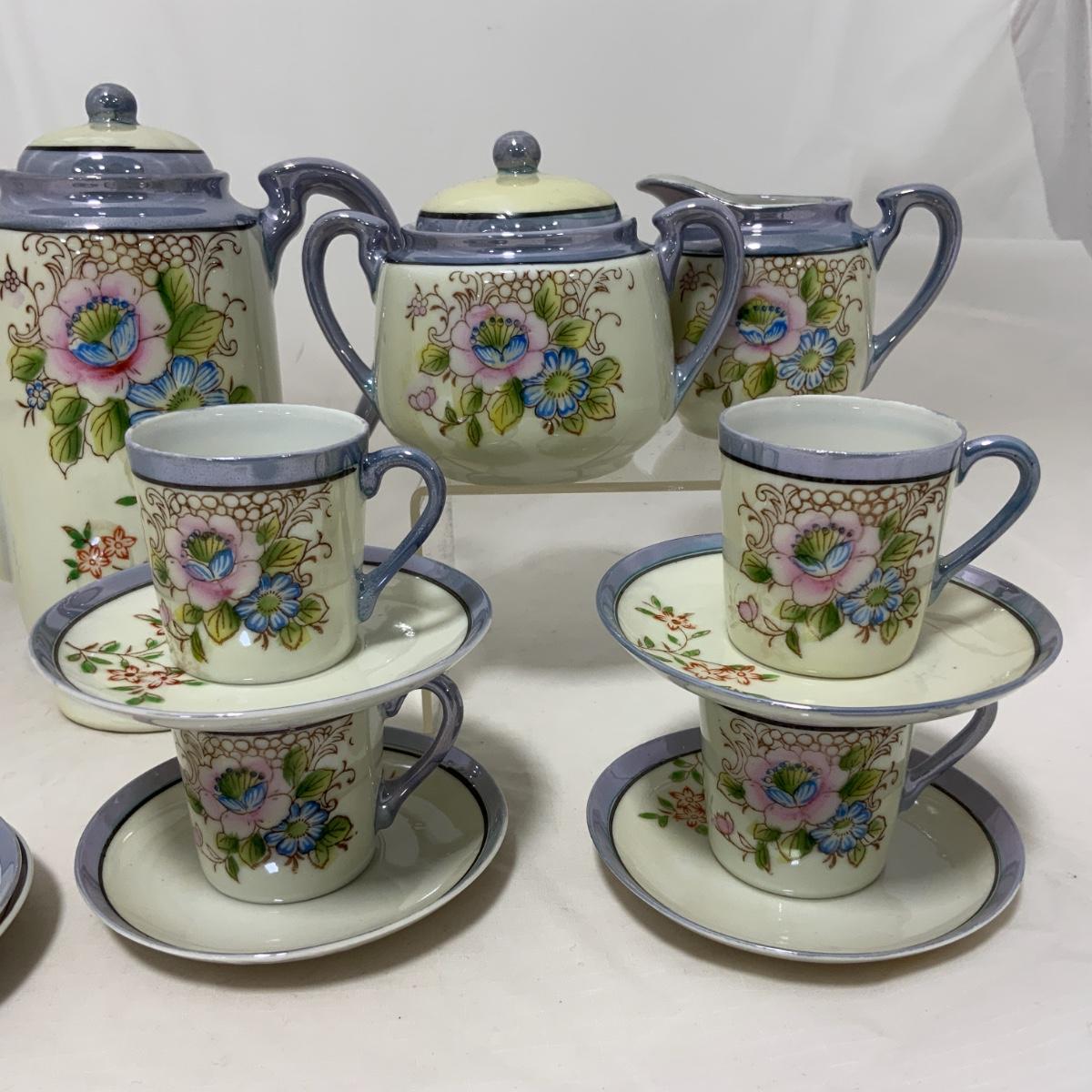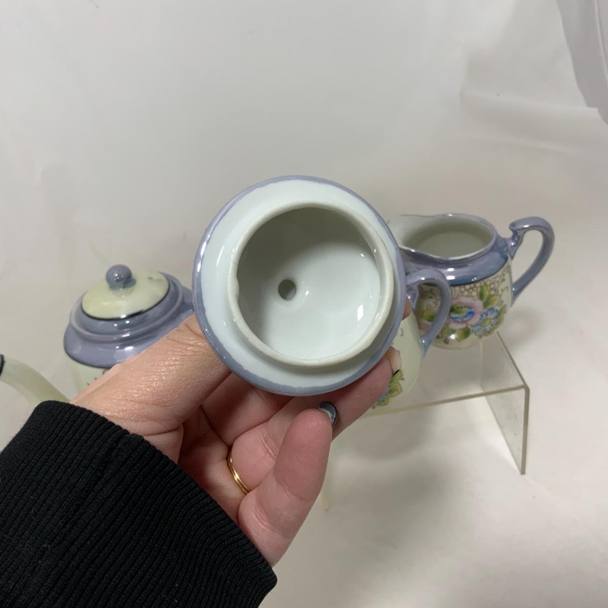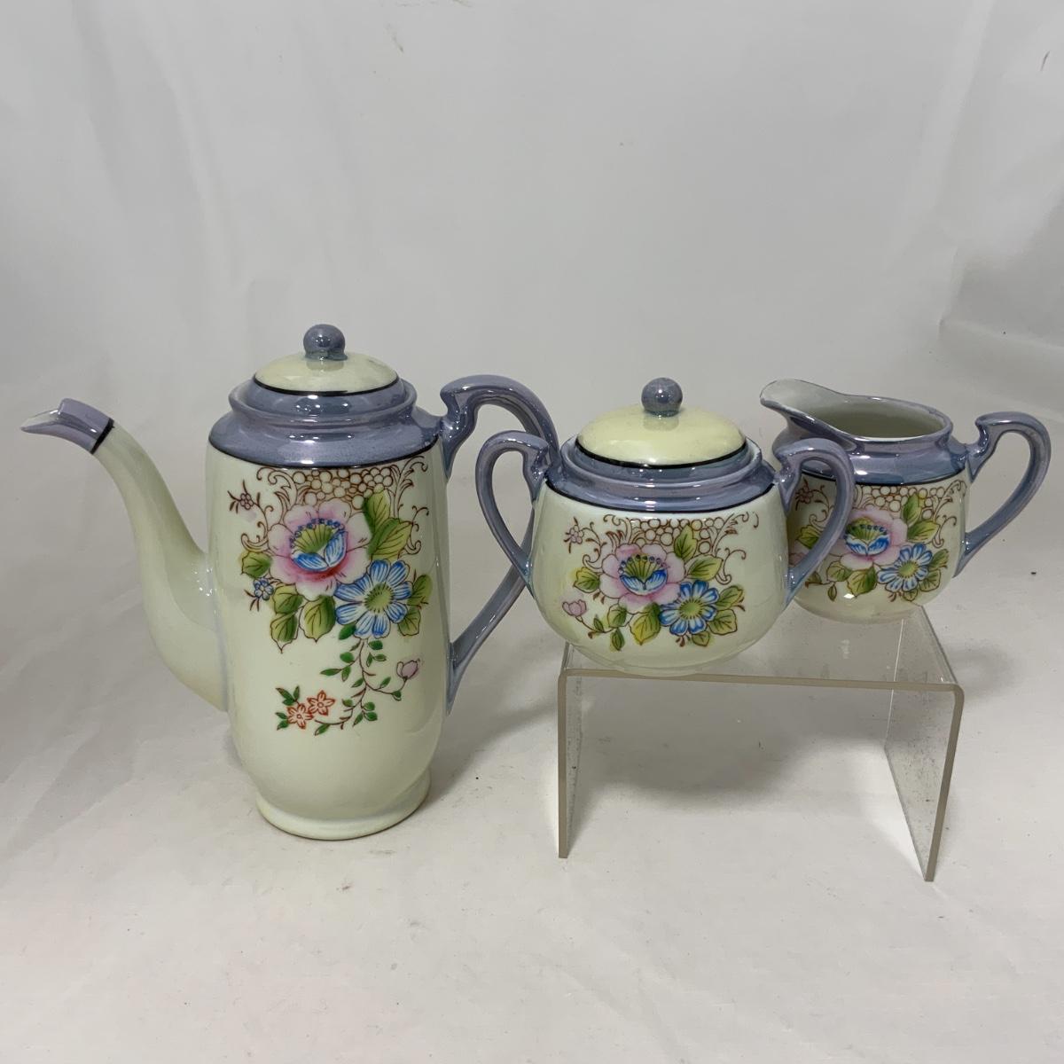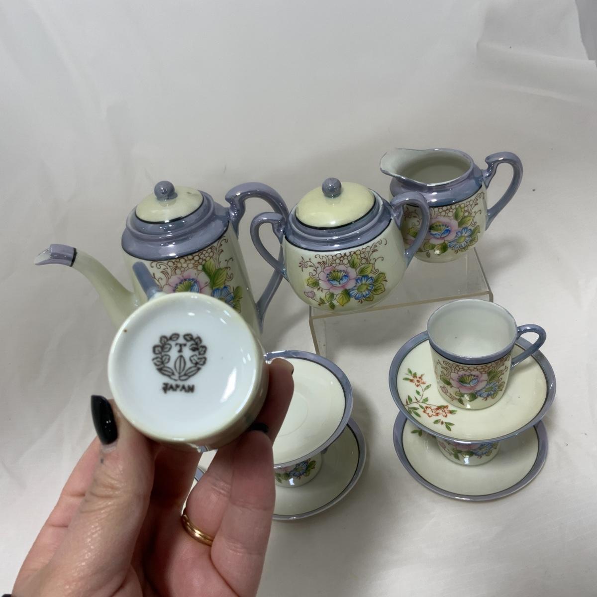 From the Estate of Peter and Alice Radovanovich: Adorable Vintage Tea Set, Made in Japan. Beautiful Purple accent on Ivory china with flowers. Set is in fine vintage condition, with minor issues. Please see photos for details and condition. ::: Shipping is NOT available on this lot. If you have any questions regarding this lot please contact the auctioneer either via this website, by direct email or by phone. PICK UP TIMES and other important information can be found in the TERMS and DESCRIPTION of the auction. Please take a look for pertinent information. Thanks!