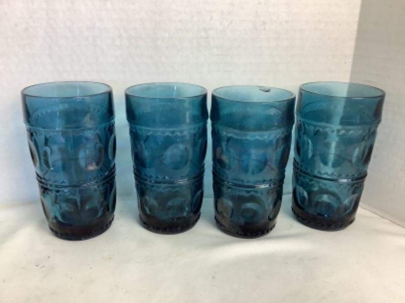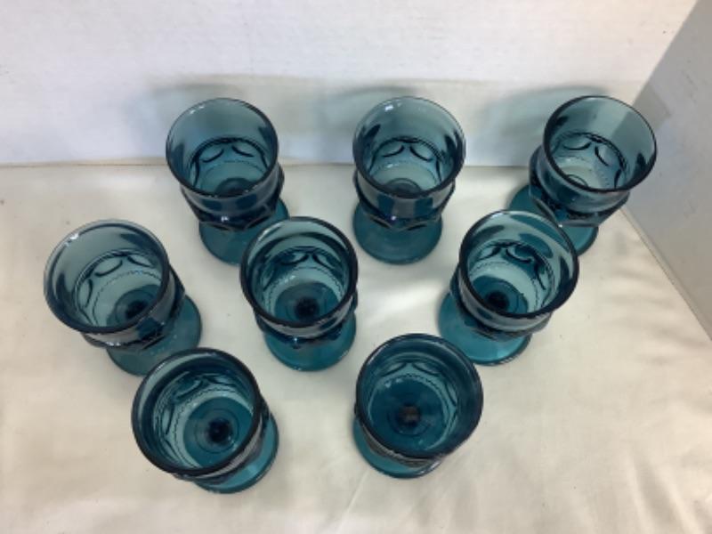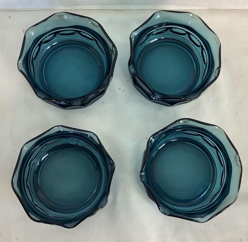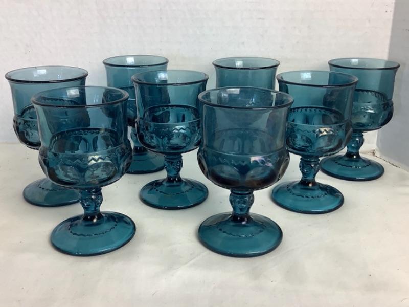 4- Water Glasses measuring 5-1/2” tall, 1 has a chip on the rim (see photos) 8 small goblets measuring 4-1/2” tall and 4 bowls measuring 4” round and 2-1/4” high