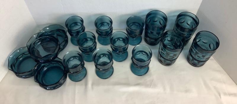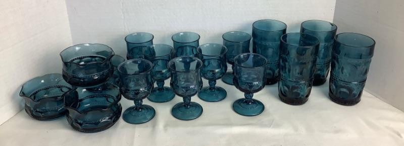 16 pieces of Indiana Glass Kings Crown Pattern Aquamarine Blue glassware