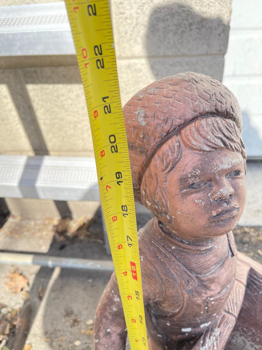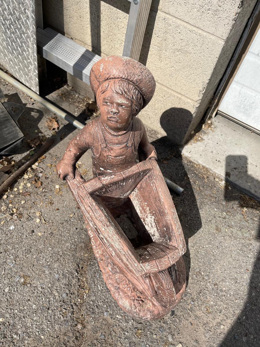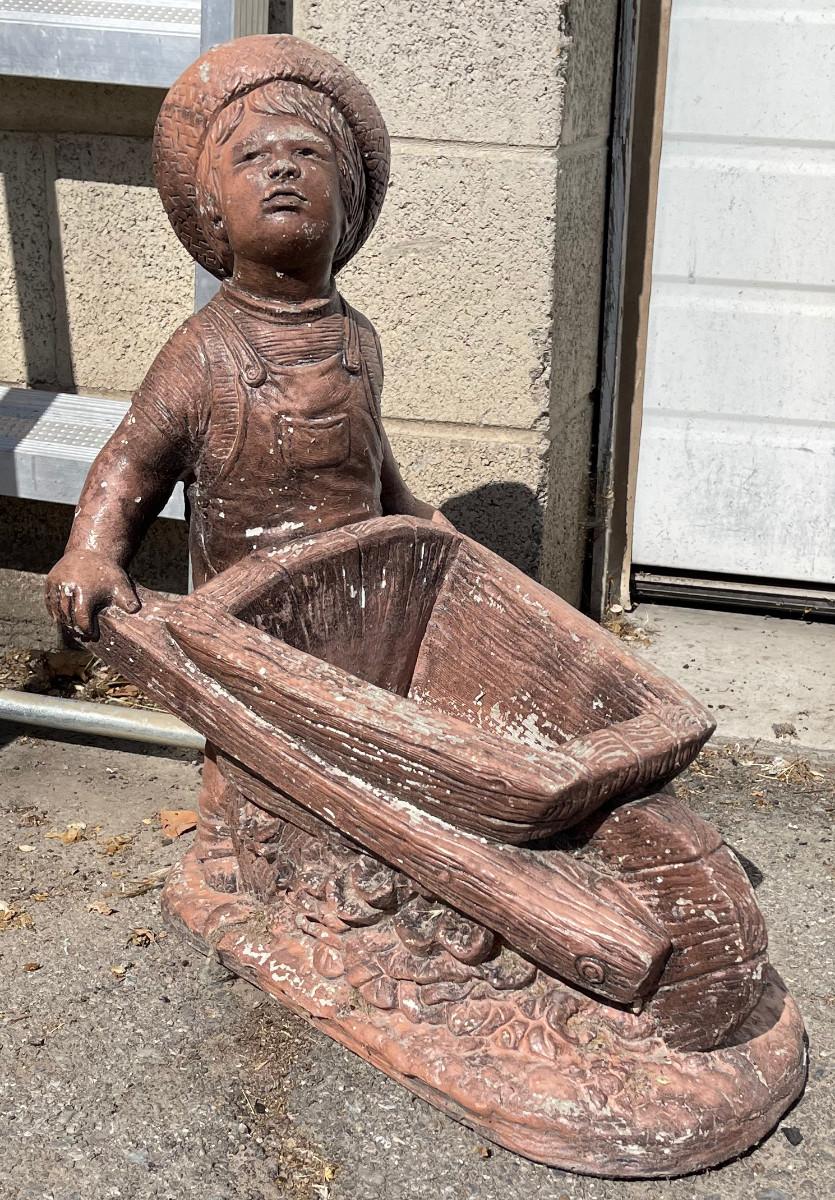 #216 Concrete Yard Art Boy with Wheelbarrow