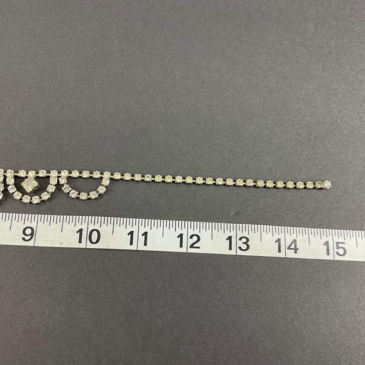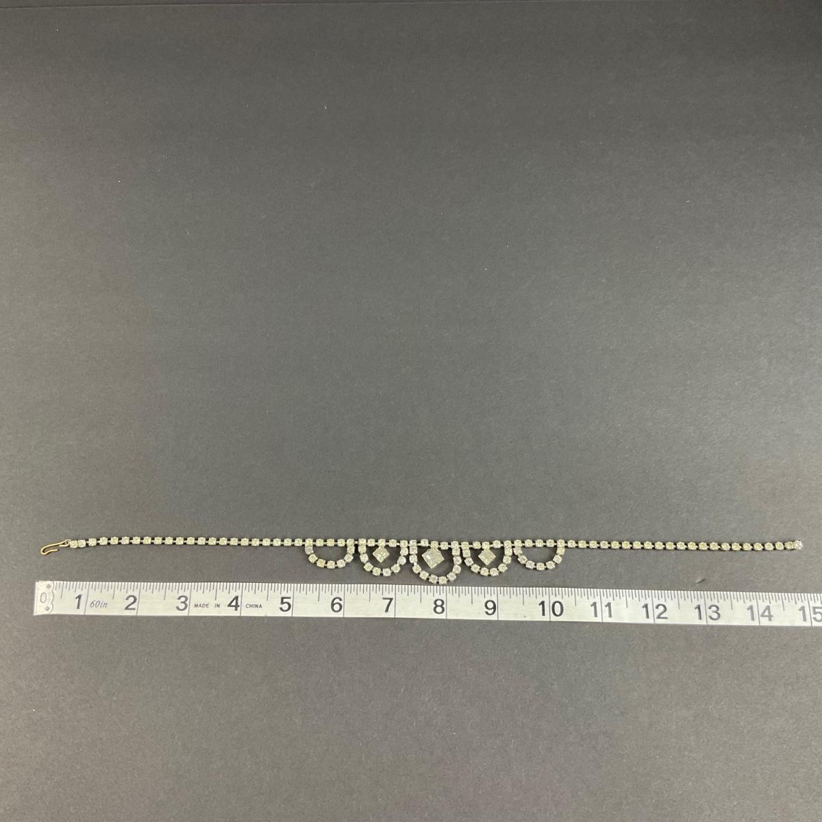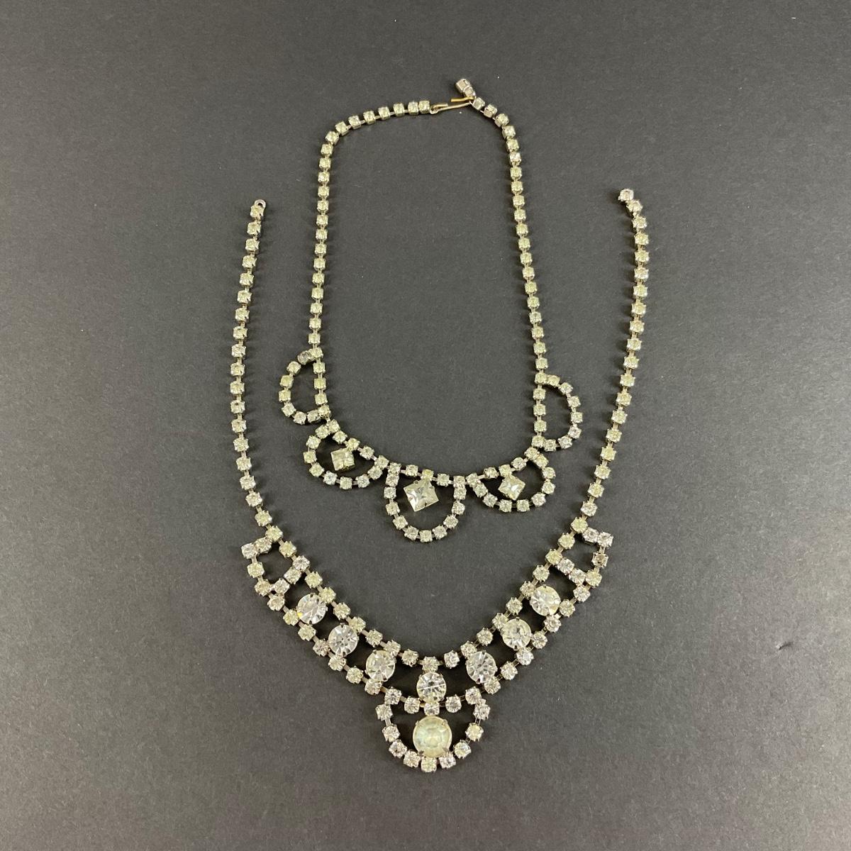 Two unmarked rhinestone necklaces. One is broken and has no clasps. Please see photos for details and condition. Any condition statement is given as a courtesy to a client, is an opinion, and should not be treated as a statement of fact. Reference to condition written, oral or within a condition report shall not be regarded as a full account of condition and may not include all defects, alterations, or restorations. Absence of a condition report does not imply a lot is flawless or lacking imperfections or damage. Katherine’s Auction & Appraisal Service shall have no responsibility for any error or omission. Returns shall not be accepted on the basis of condition. ::: Shipping is available on this lot. If you require shipping you must let us know at the close of the auction. We will coordinate with you after the item has been won. Shipping fees will include insurance up to or exceeding the value of all items being mailed. If you have any questions regarding this lot please contact the auctioneer either via this website, by direct email or by phone. PICK UP TIMES and other important information can be found in the TERMS and DESCRIPTION of the auction. Please take a look for pertinent information. Thanks!