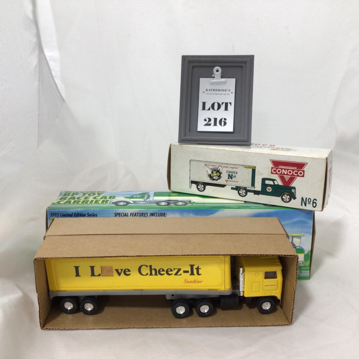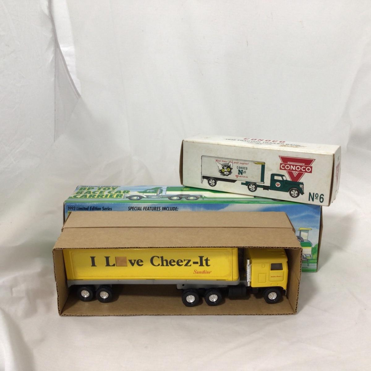 216) DIE CAST| Cheez It Semi, BP Race Car Carrier, and Conco Semi