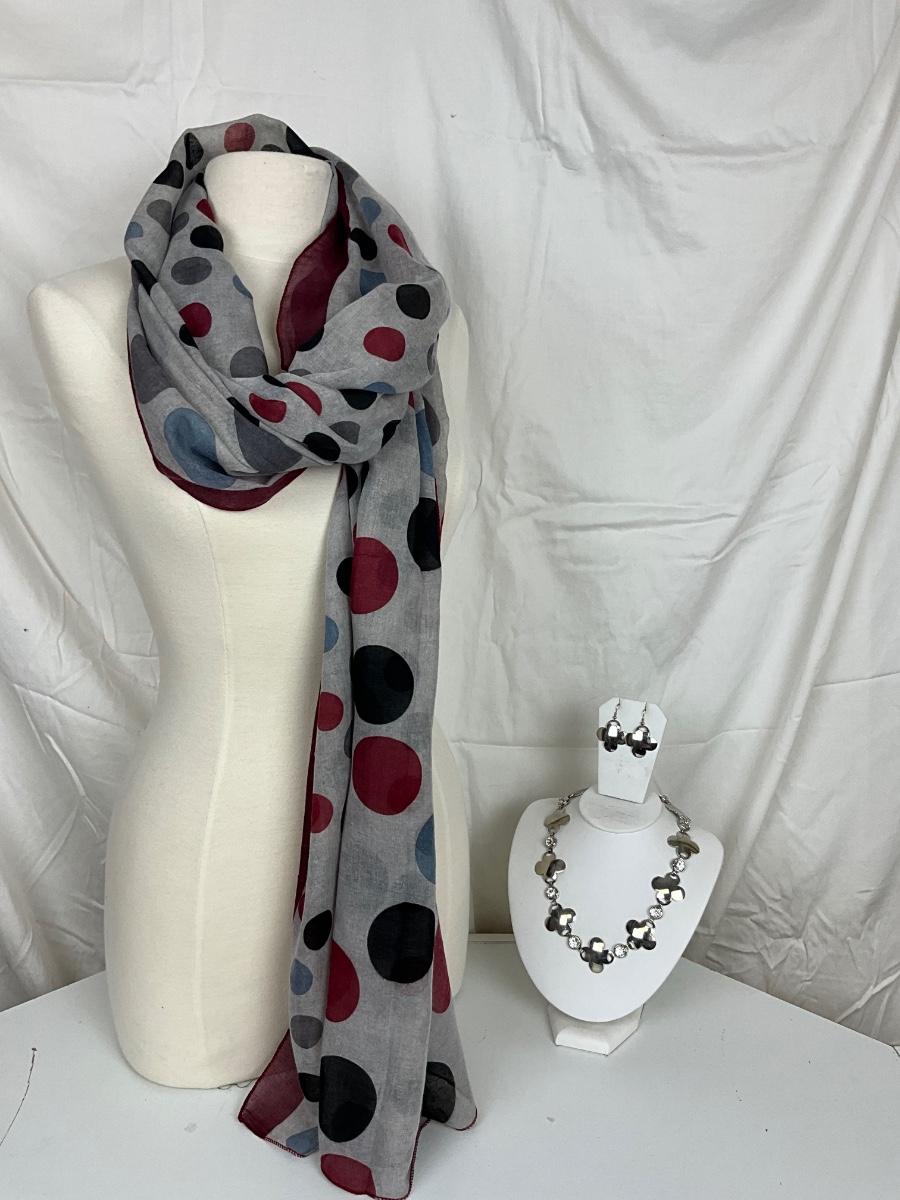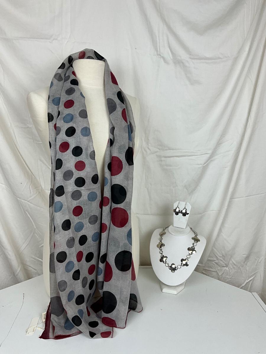 216 Gray Polka Dot Shawl/ Scarf with Silvertone Necklace and Earrings Set
