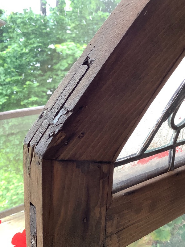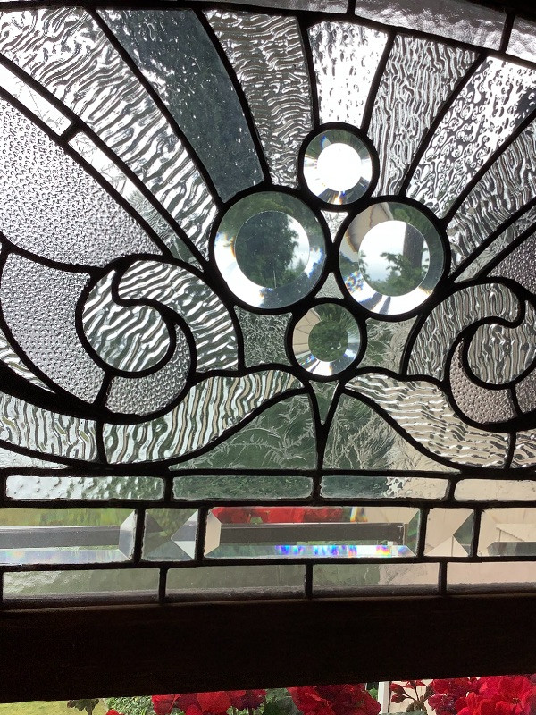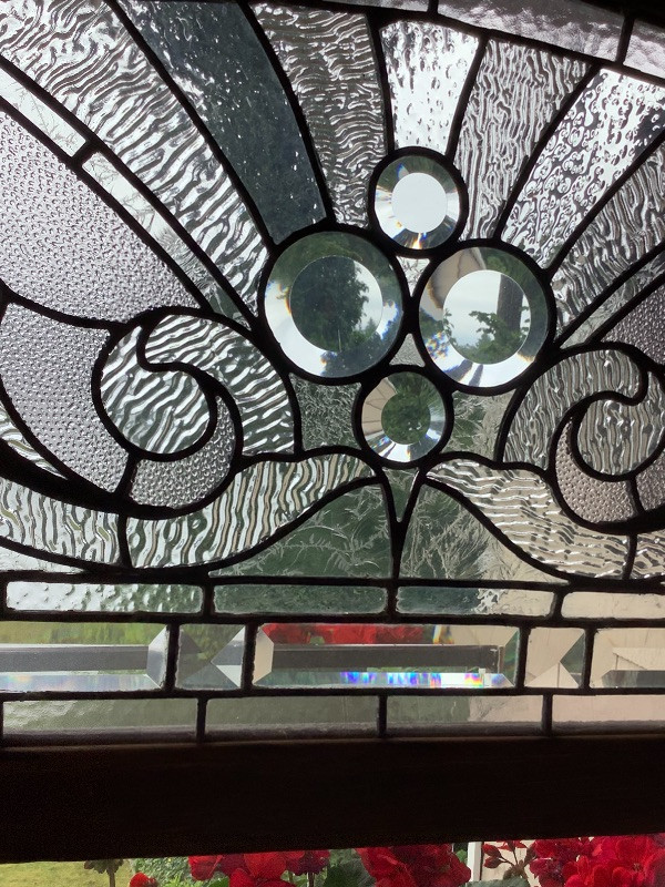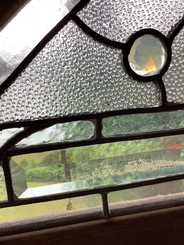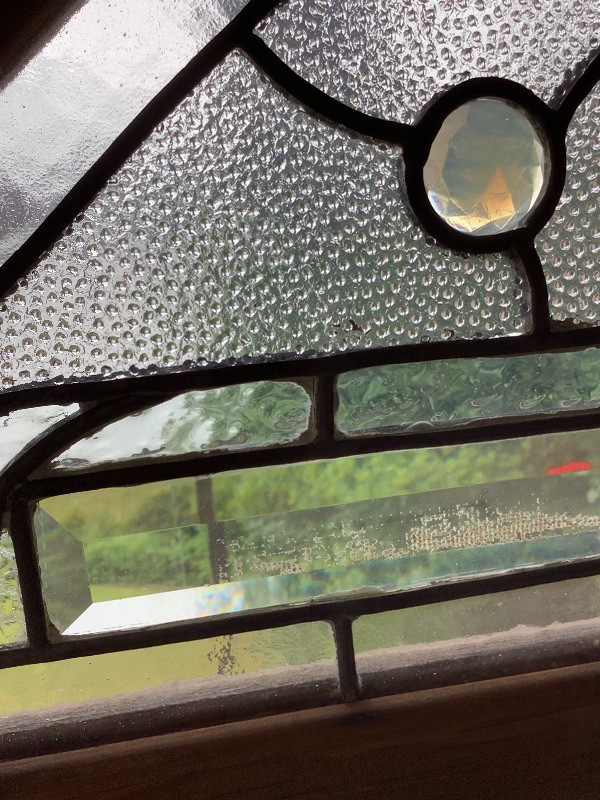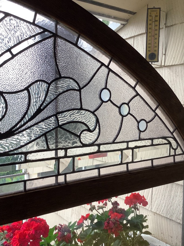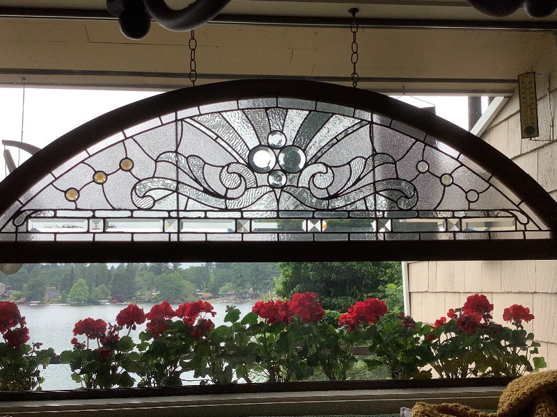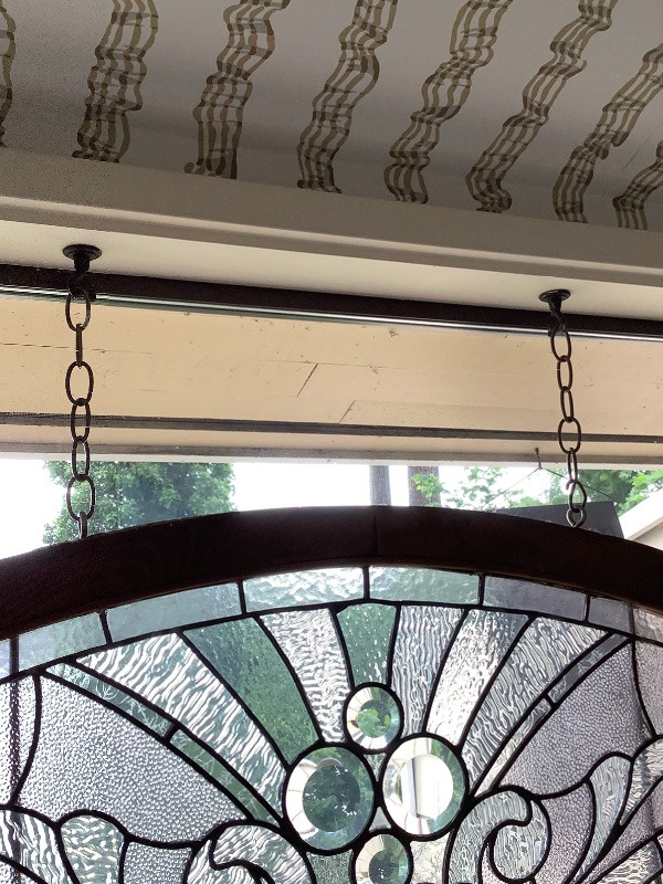 Large wood framed Stain Glass Window Hanging measures 20” tall x 64” wide