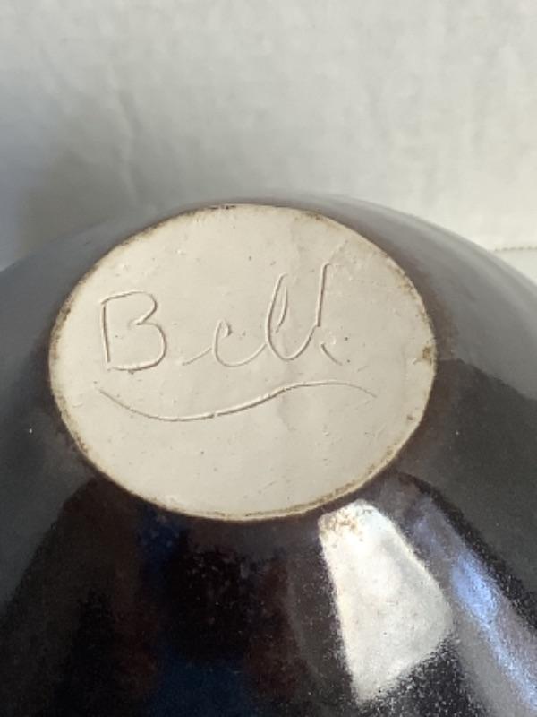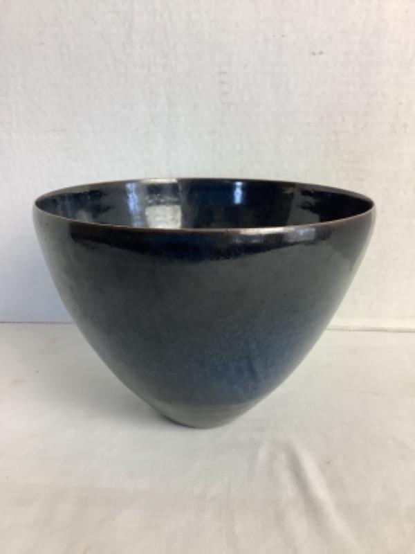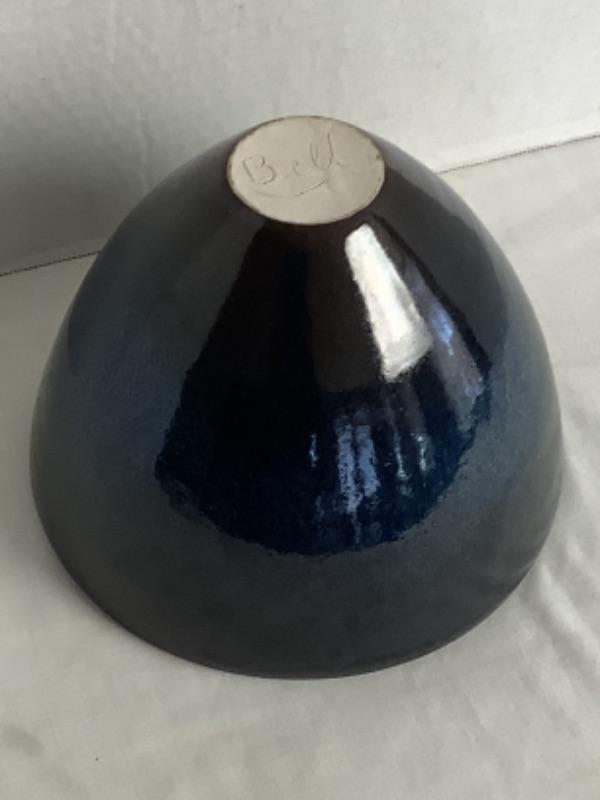 Beautiful mid century blue glazed pottery bowl signed Bell on the bottom measures 6” tall and 8-1/4” round