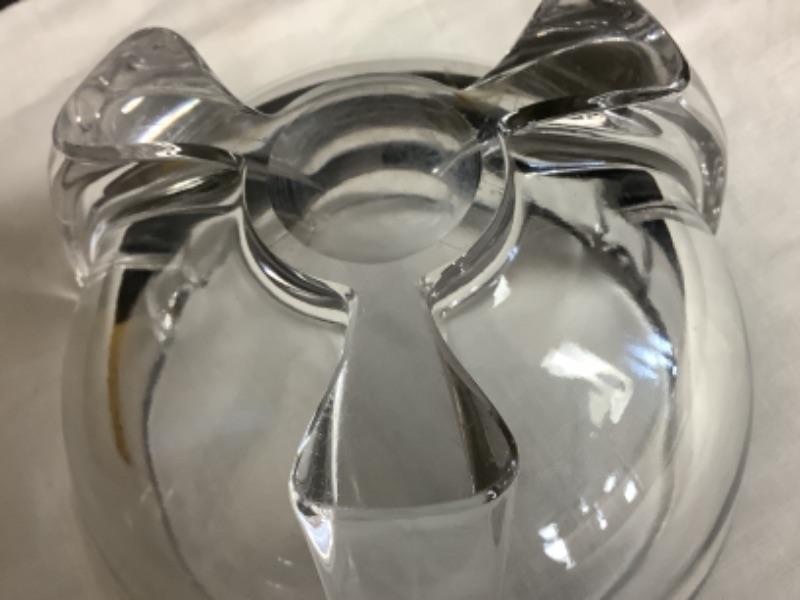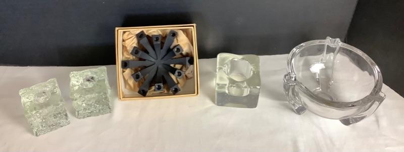 Mid century Hallmark Danish Taper Candle Holder new in box, cast iron. Three mid century glass cube candle holders two measures 2” x 2” and 2” tall, 1 measures 2-3/4” x 2-3/4” and 2” tall. Mid century footed glass bowl measuring 5-1/2” round and 3” deep, has some minor scratches on the base