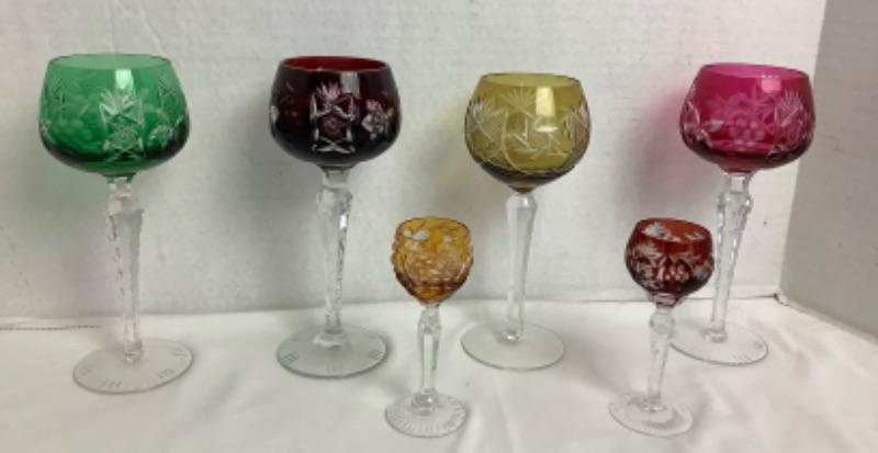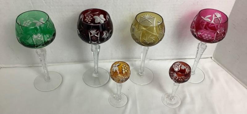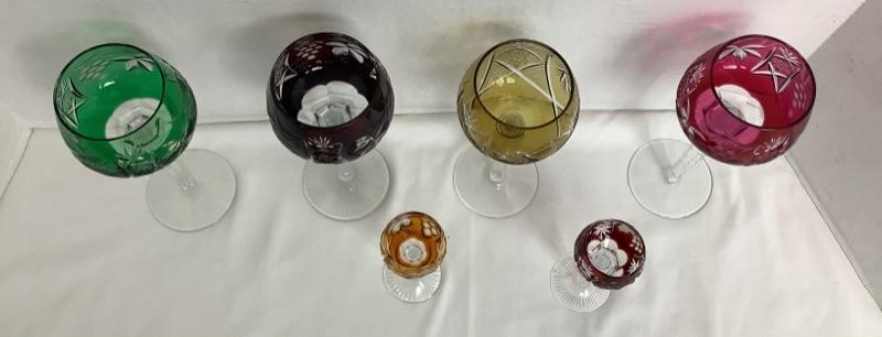 Four vintage colored cut crystal wine glasses measuring 8” tall in excellent condition and two vintage colored cut crystal cordials measuring 4-1/2” tall in excellent condition