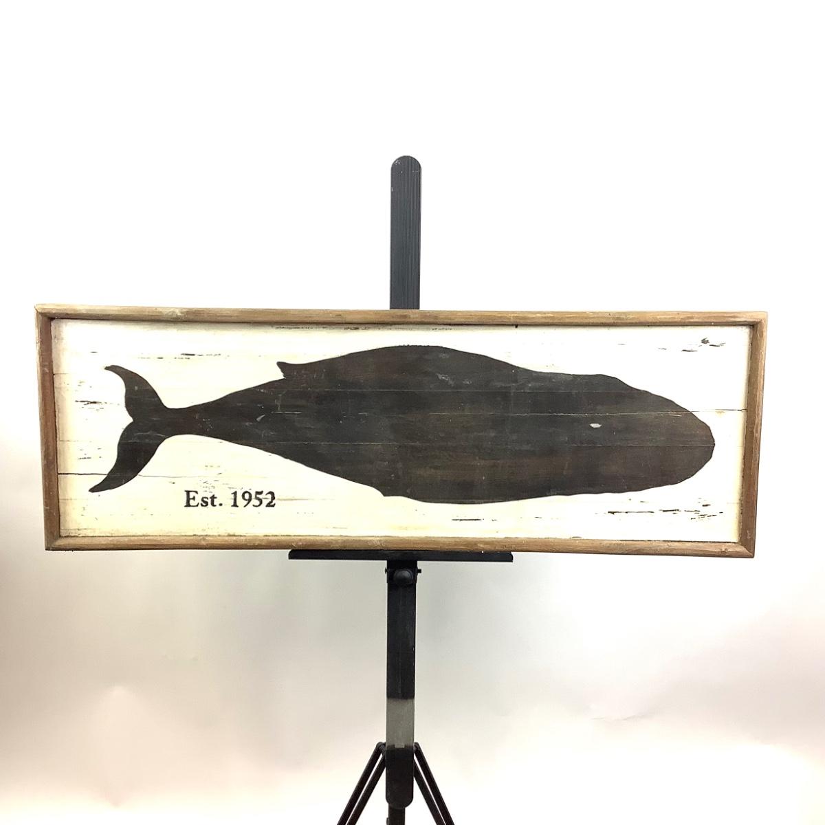 Black painted country-style whale on white board in Frame, "Est. 1952". Ready to hang, Made in Philippines, Intentionally distressed. Measures 35"W, 12"H, 1.25"D.