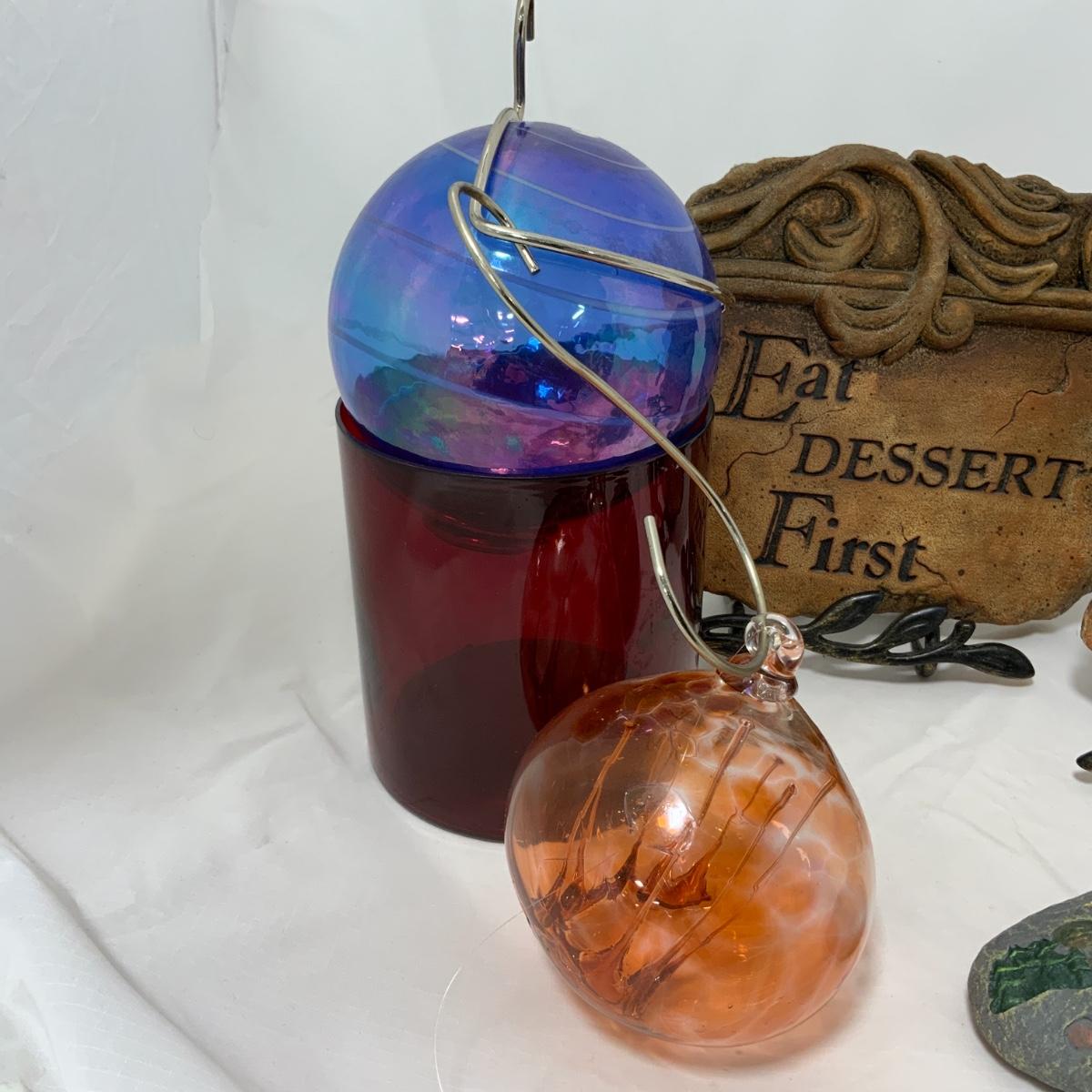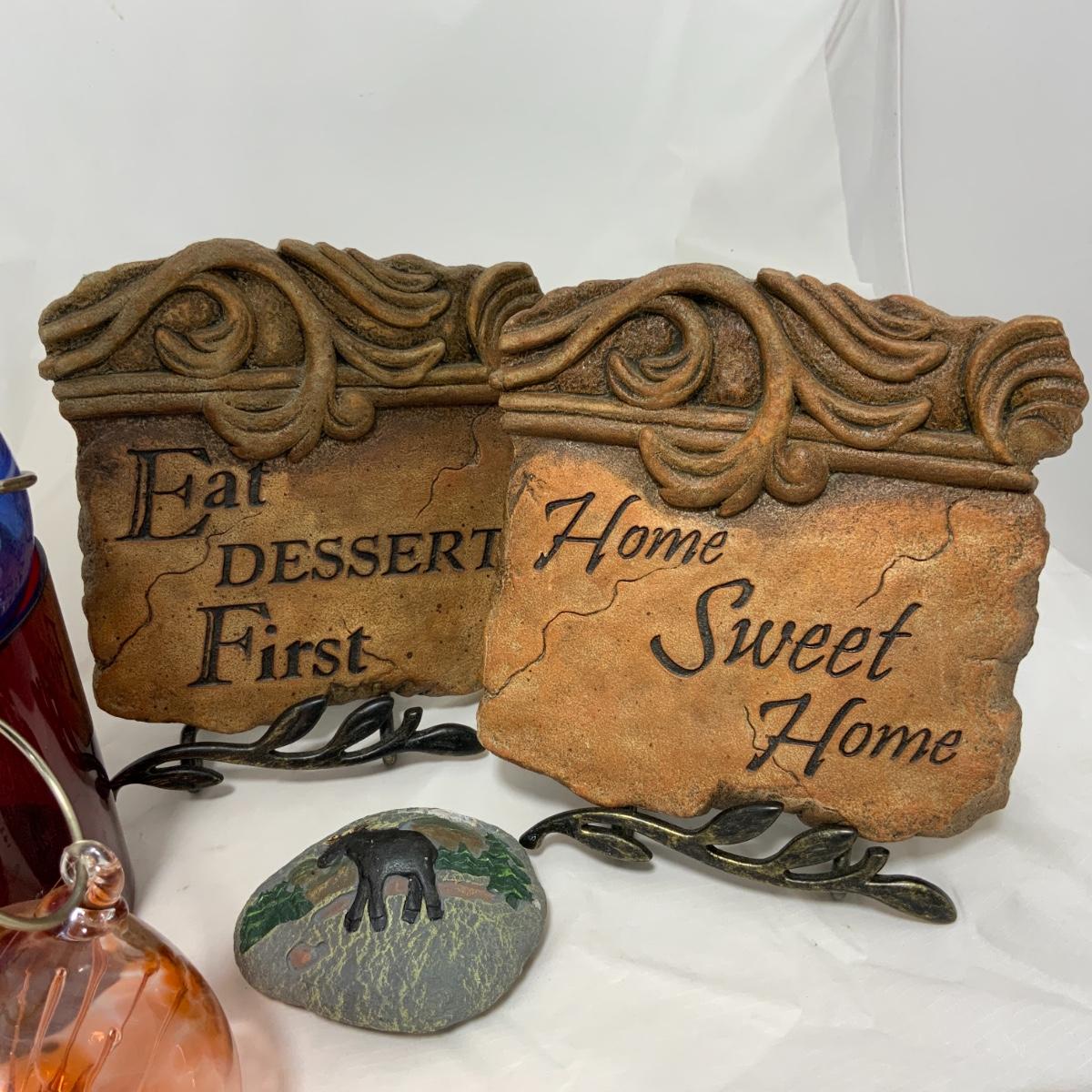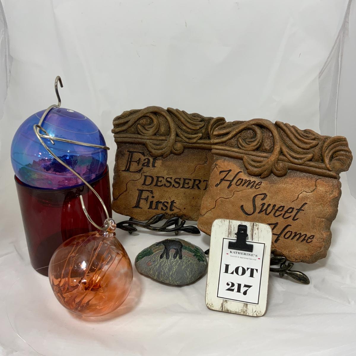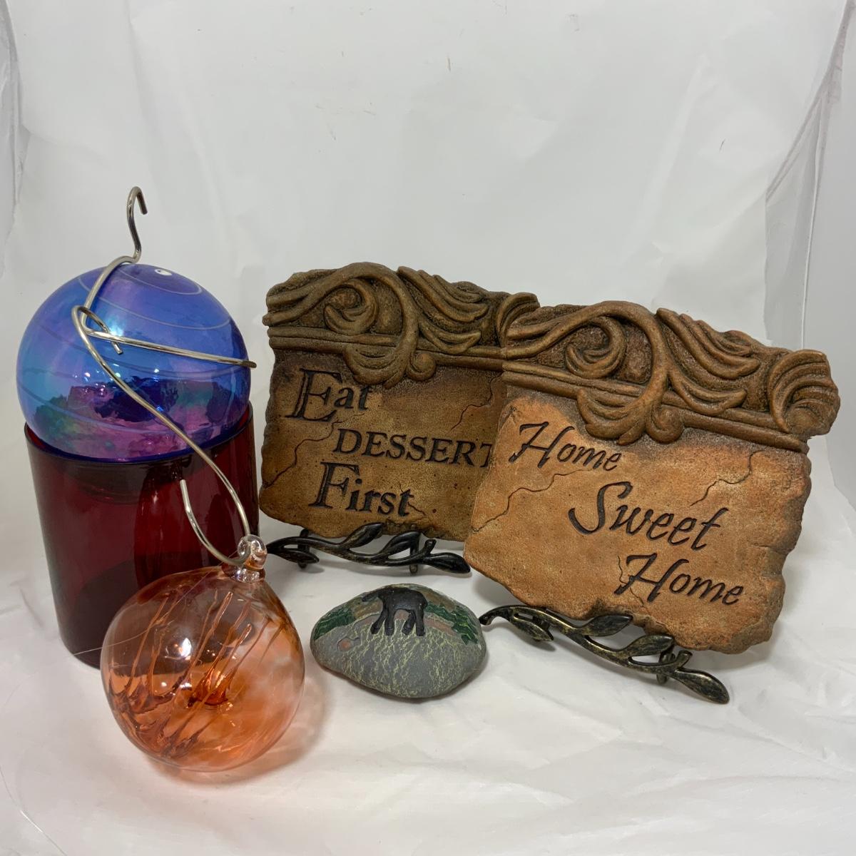 From the Estate of Peter and Alice Radovanovich: Garden Decor to accent your annuals! Hang the glass balls from a tree, hide the moose rock for your grandkids to find, plant some flowers in the red vase and hang the plaques by your door! Yes, I’m available for decorating work too - just let me know! Please see photos for details and condition. ::: Shipping is NOT available on this lot. If you have any questions regarding this lot please contact the auctioneer either via this website, by direct email or by phone. PICK UP TIMES and other important information can be found in the TERMS and DESCRIPTION of the auction. Please take a look for pertinent information. Thanks!