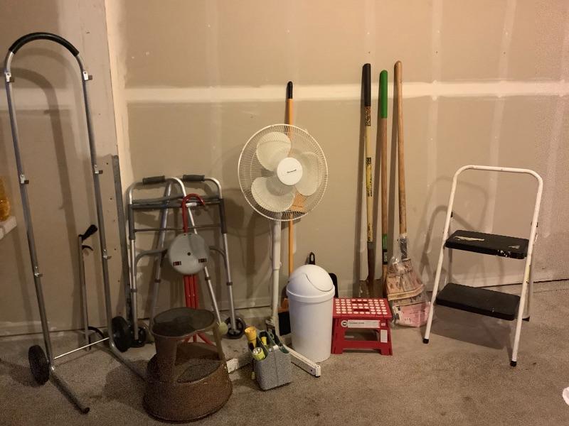 Garden Tools, Lawn furniture Dolly Cart, fan, Stepping stools, Walkers, assist stand, garbage can, flashlights. Lots of items!