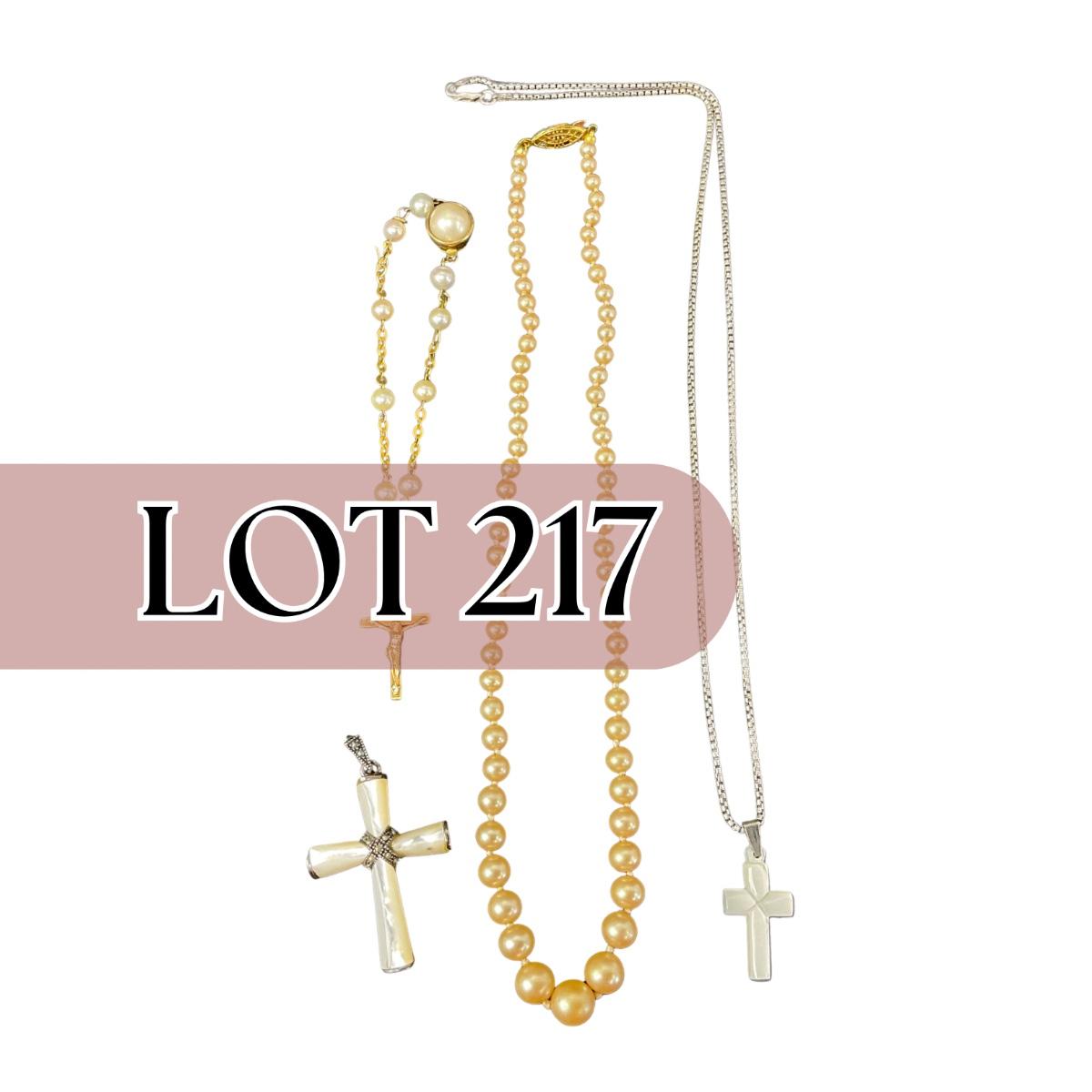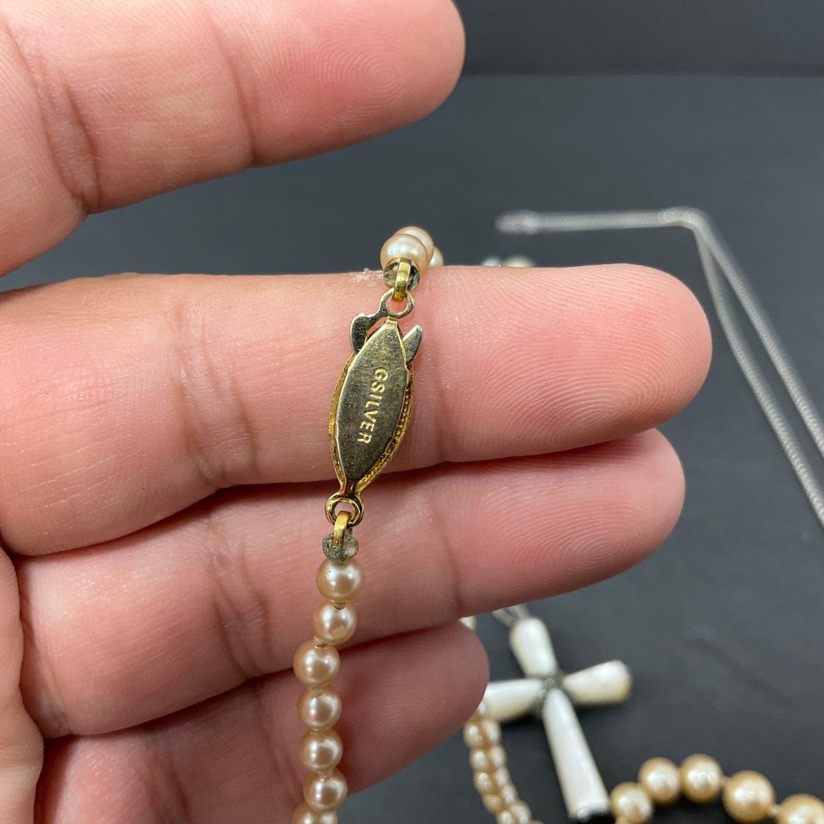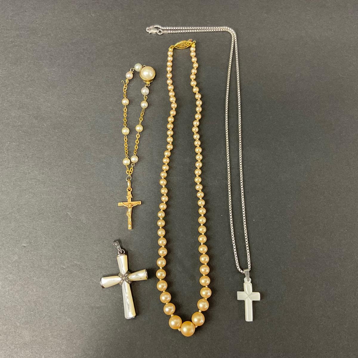 Assortment of religious pieces and pearls. There is some marked sterling silver. Please see photos for details and condition. Any condition statement is given as a courtesy to a client, is an opinion, and should not be treated as a statement of fact. Reference to condition written, oral or within a condition report shall not be regarded as a full account of condition and may not include all defects, alterations, or restorations. Absence of a condition report does not imply a lot is flawless or lacking imperfections or damage. Katherine’s Auction & Appraisal Service shall have no responsibility for any error or omission. Returns shall not be accepted on the basis of condition. ::: Shipping is available on this lot. If you require shipping you must let us know at the close of the auction. We will coordinate with you after the item has been won. Shipping fees will include insurance up to or exceeding the value of all items being mailed. If you have any questions regarding this lot please contact the auctioneer either via this website, by direct email or by phone. PICK UP TIMES and other important information can be found in the TERMS and DESCRIPTION of the auction. Please take a look for pertinent information. Thanks!