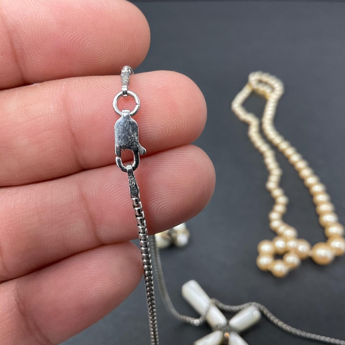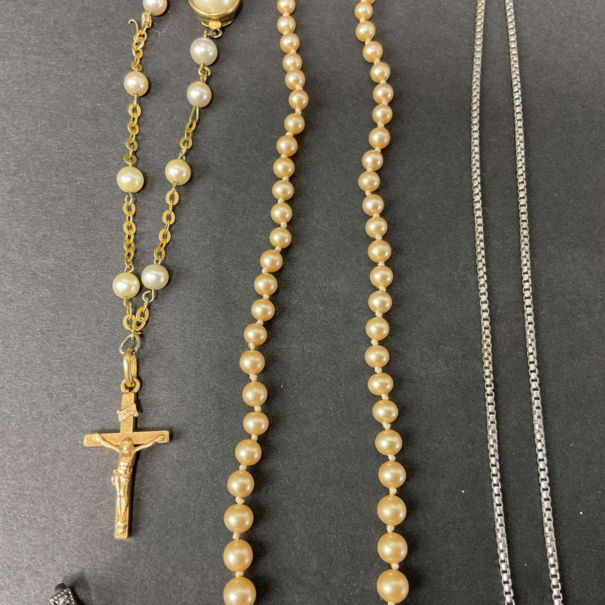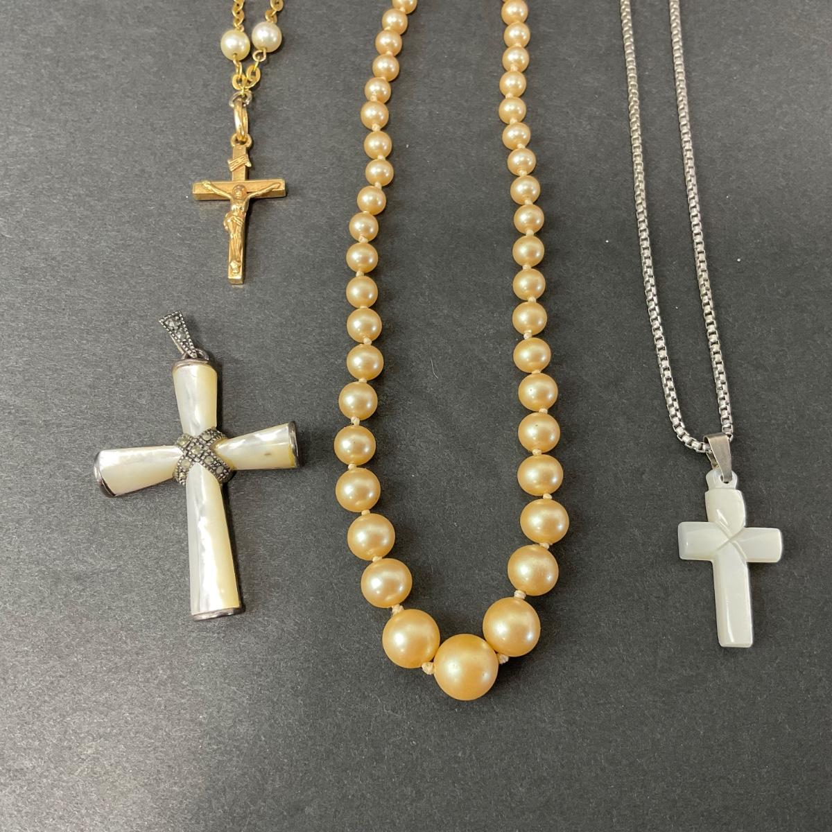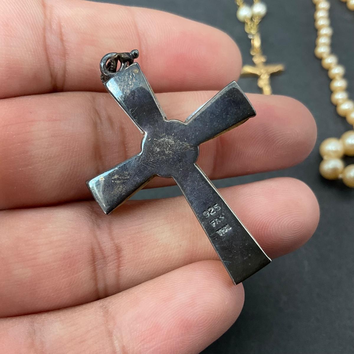 Assortment of religious pieces and pearls. There is some marked sterling silver. Please see photos for details and condition. Any condition statement is given as a courtesy to a client, is an opinion, and should not be treated as a statement of fact. Reference to condition written, oral or within a condition report shall not be regarded as a full account of condition and may not include all defects, alterations, or restorations. Absence of a condition report does not imply a lot is flawless or lacking imperfections or damage. Katherine’s Auction & Appraisal Service shall have no responsibility for any error or omission. Returns shall not be accepted on the basis of condition. ::: Shipping is available on this lot. If you require shipping you must let us know at the close of the auction. We will coordinate with you after the item has been won. Shipping fees will include insurance up to or exceeding the value of all items being mailed. If you have any questions regarding this lot please contact the auctioneer either via this website, by direct email or by phone. PICK UP TIMES and other important information can be found in the TERMS and DESCRIPTION of the auction. Please take a look for pertinent information. Thanks!