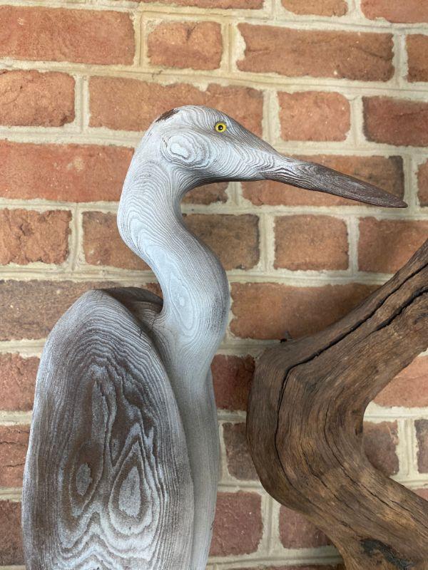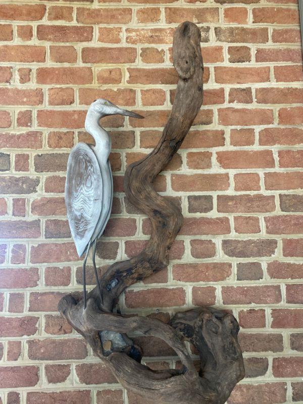 Unsigned Large White Egret Carving on Driftwood. His feet are metal and the piece measures 40" x 24" wide