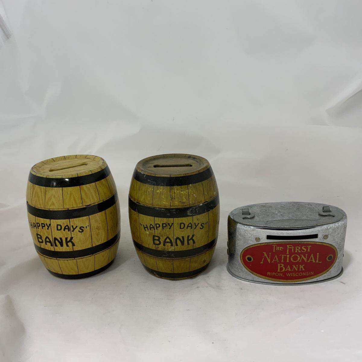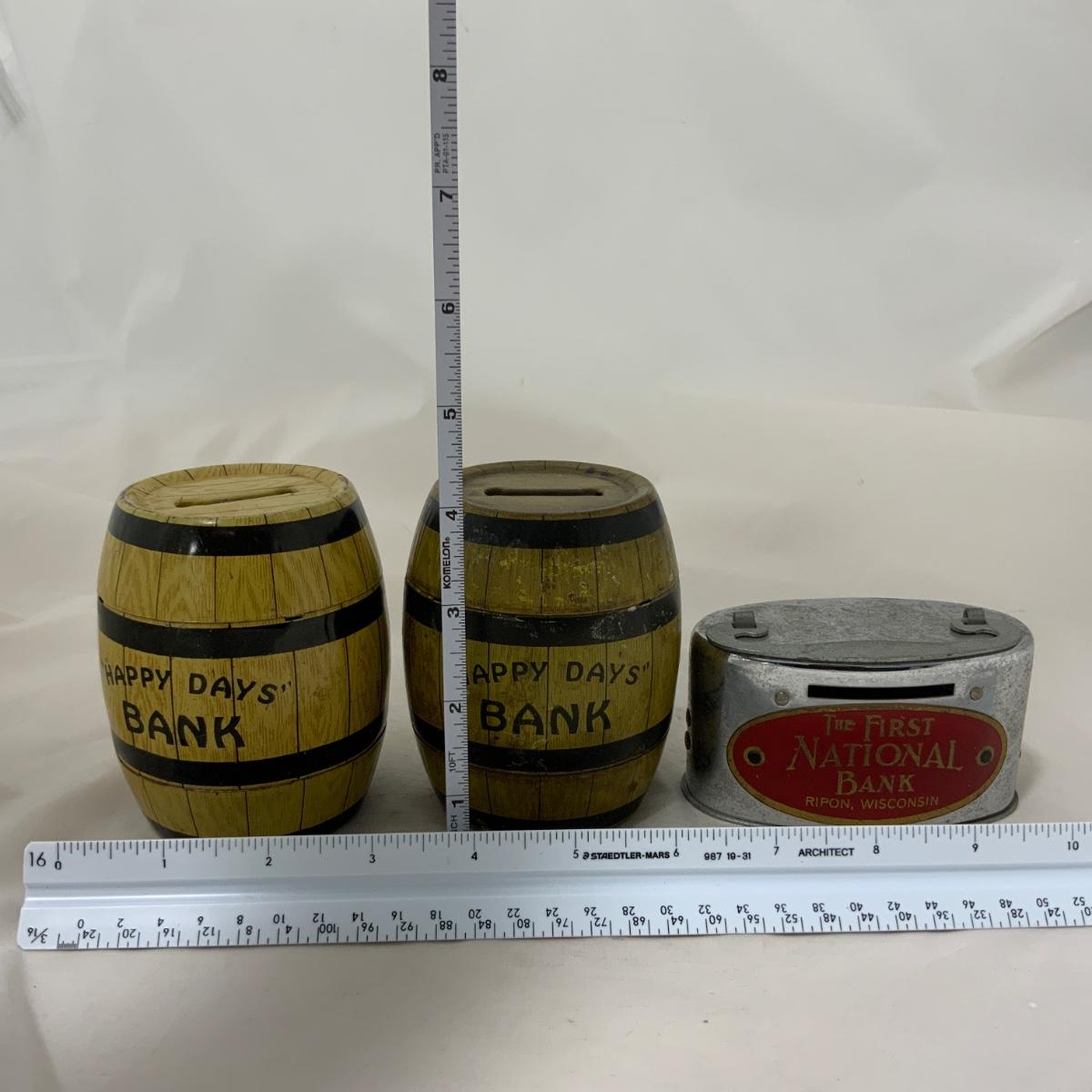 Three banks to start or add to your collection. One of the bottom doors on the Happy Days Bank doesn’t want to stay shut, but I’ll be honest, I didn’t try very hard. Please see photos for details and condition. ::: Shipping is NOT available on this lot. If you have any questions regarding this lot please contact the auctioneer either via this website, by direct email or by phone. PICK UP TIMES and other important information can be found in the TERMS and DESCRIPTION of the auction. Please take a look for pertinent information. Thanks!