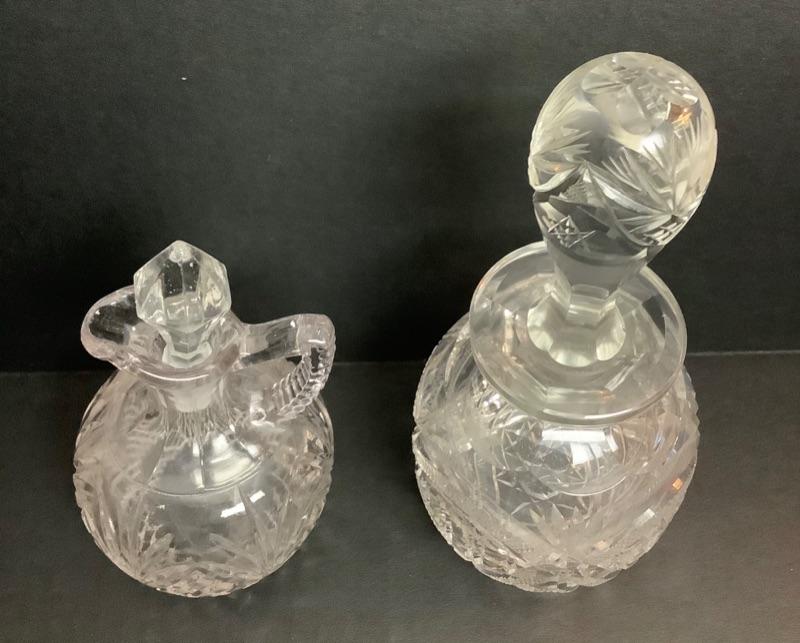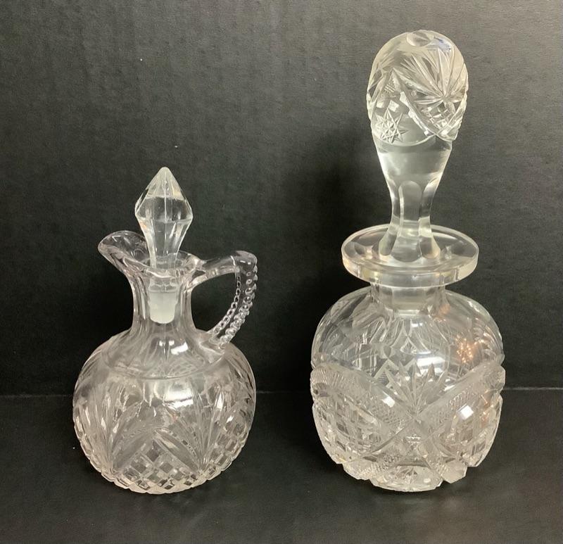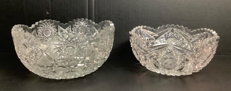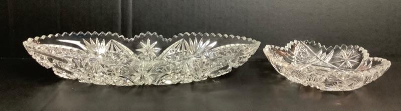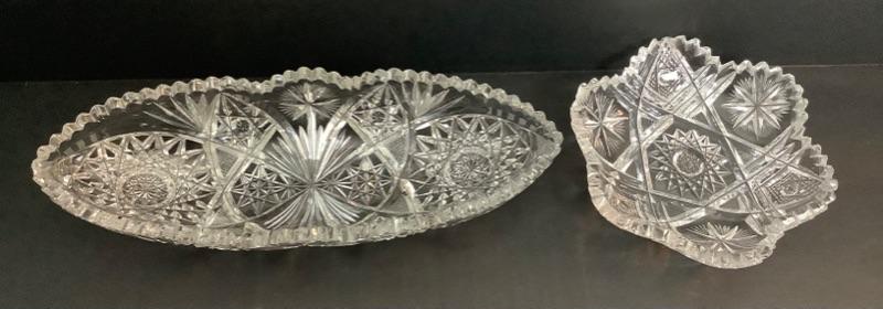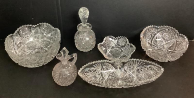 6 pieces total. 2 round cut crystal bowls, 1 oblong cut crystal dish, 1 small round cut crystal bowl and 2 cut glass crusts