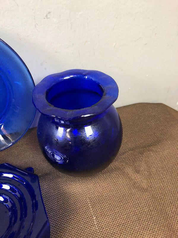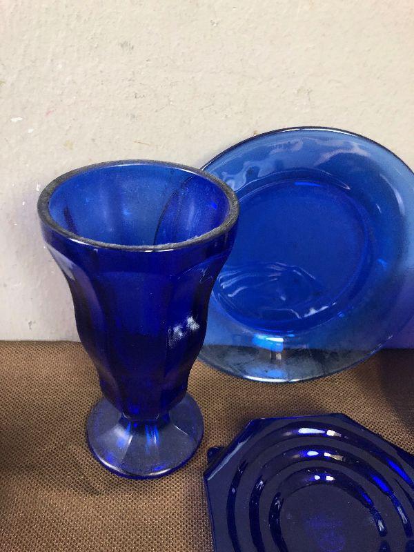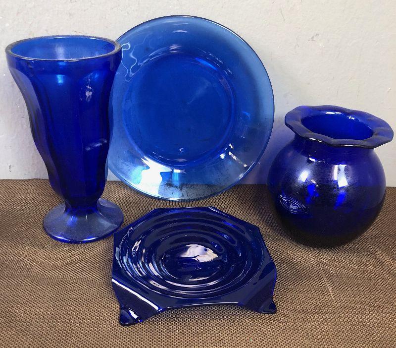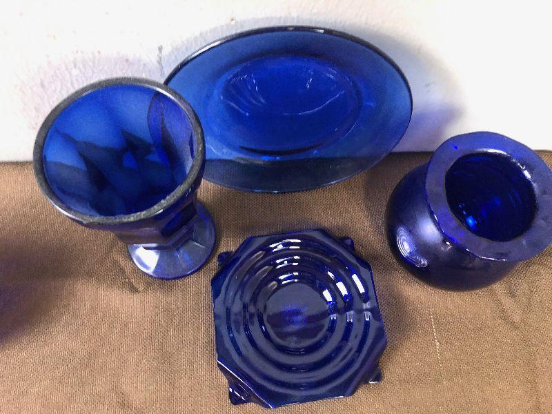#218 4 Pieces of BLUE LASS: Plate Candle Vase Malt Glass