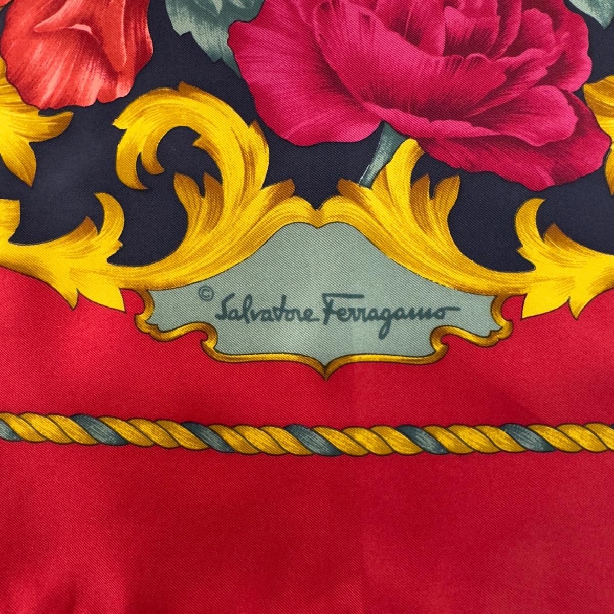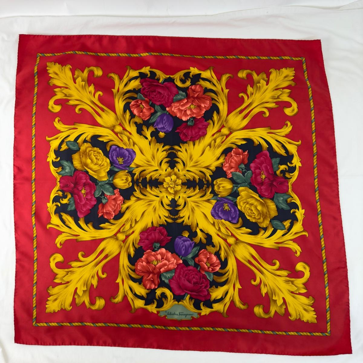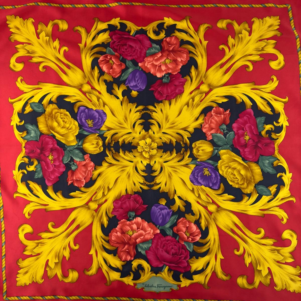 218 Authentic Salvatore Ferragamo Red & Gold Floral Design Silk Scarf