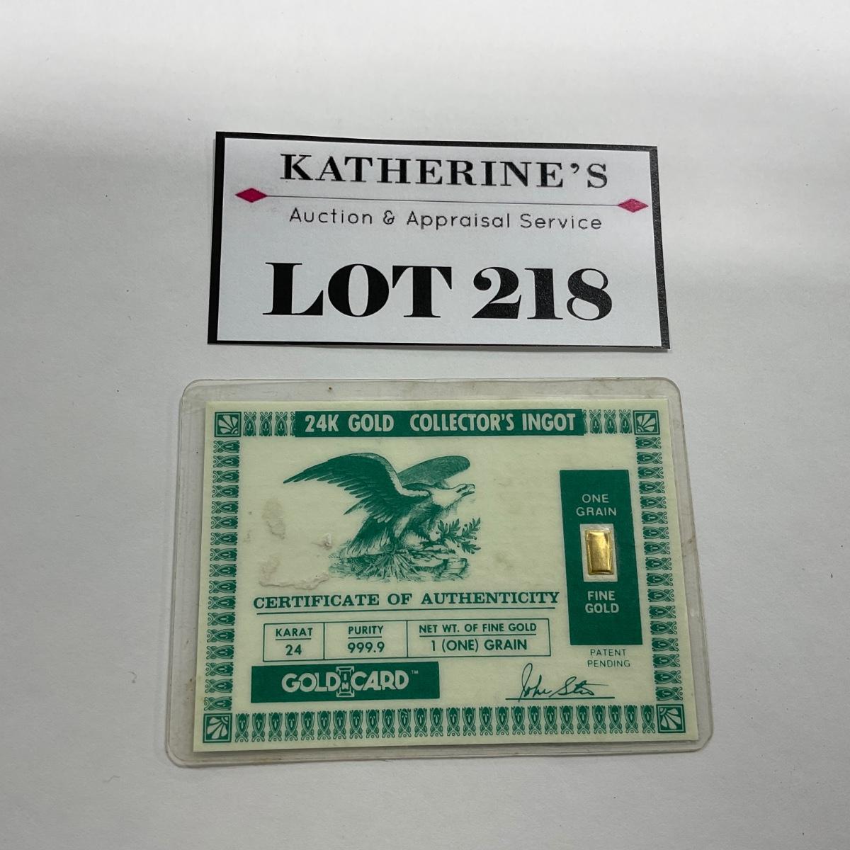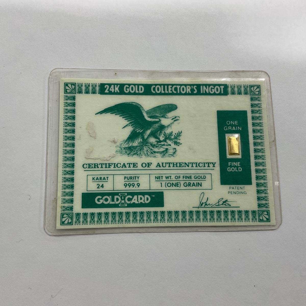 One 1981 Grain of gold sealed on Certificate of Authenticity. Please see photos for details and condition. ::: Shipping is available on this lot. If you require shipping you must let us know at the close of the auction. We will coordinate with you after the item has been won. Shipping fees will include insurance up to or exceeding the value of all items being mailed. If you have any questions regarding this lot please contact the auctioneer either via this website, by direct email or by phone. PICK UP TIMES and other important information can be found in the TERMS and DESCRIPTION of the auction. Please take a look for pertinent information. Thanks!