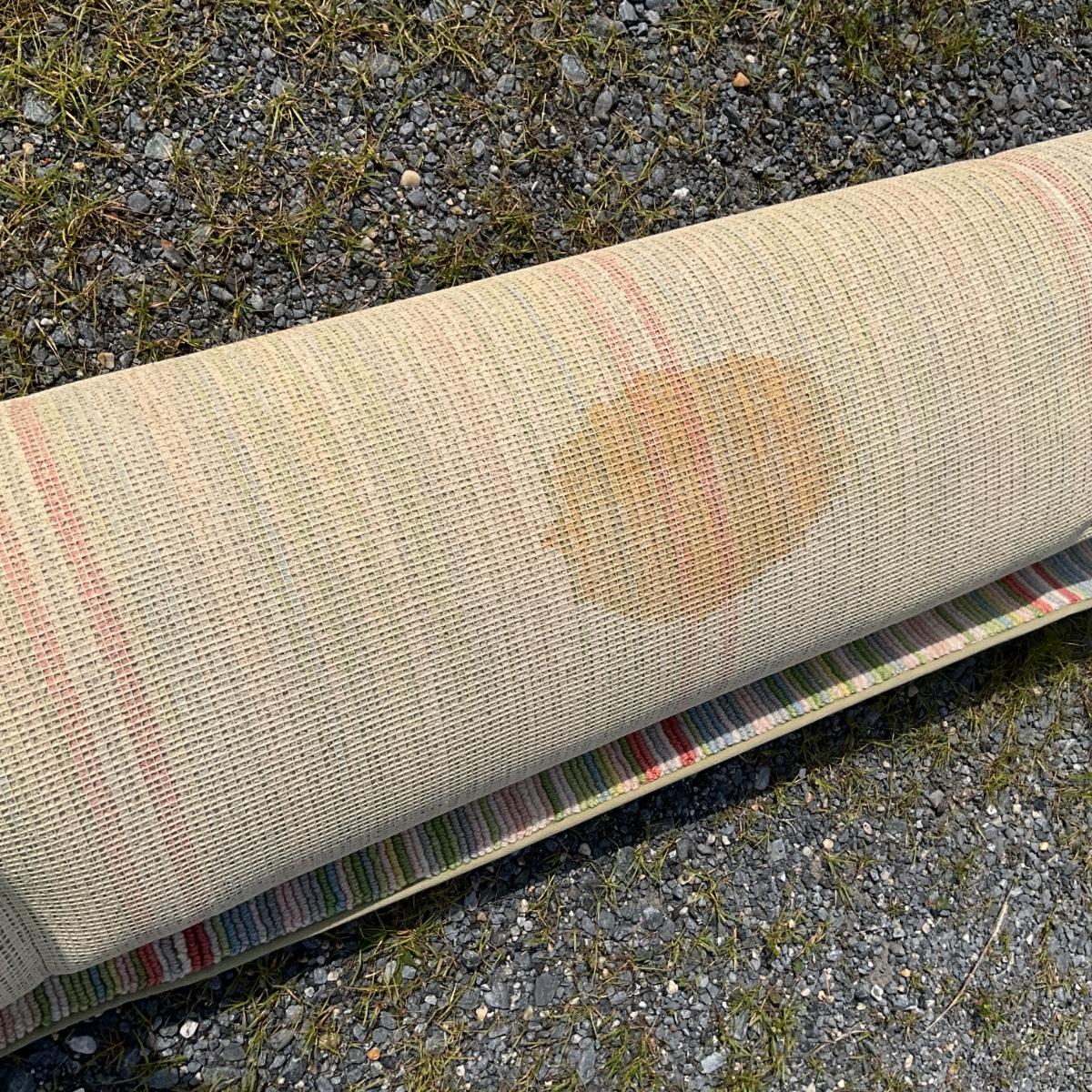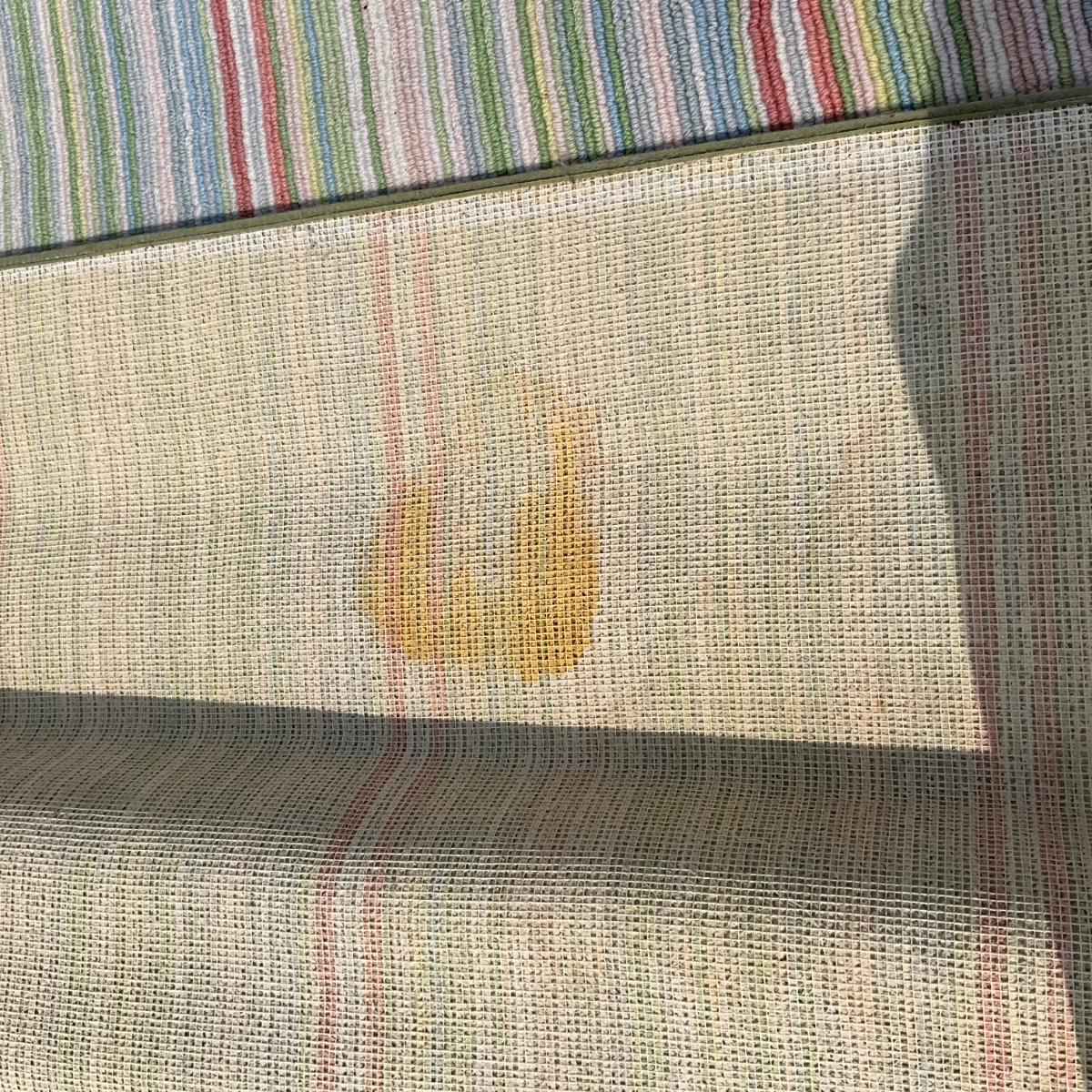 No visual spots on top, few spots on backside of rug see pictures. Over all good condition