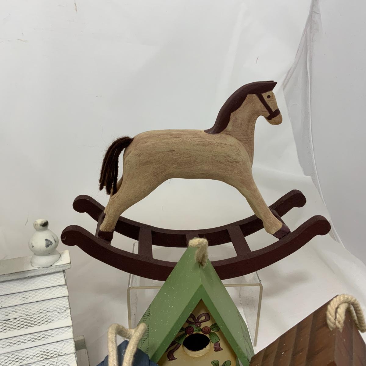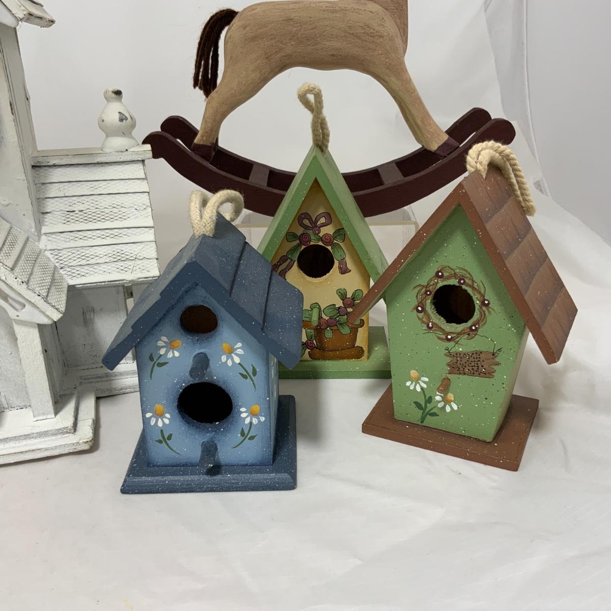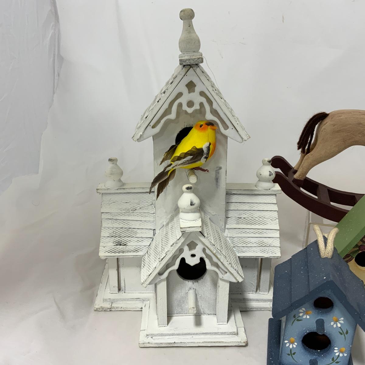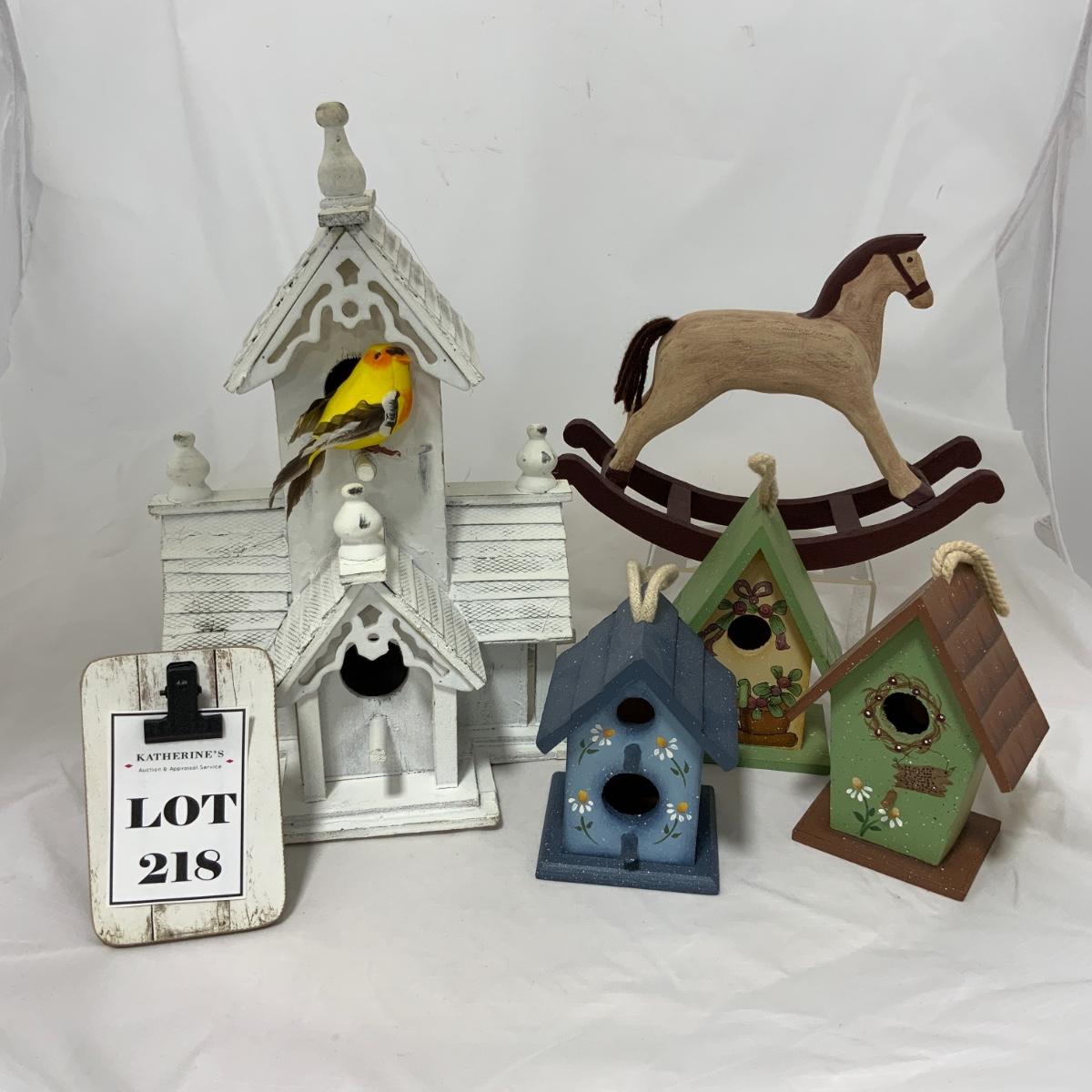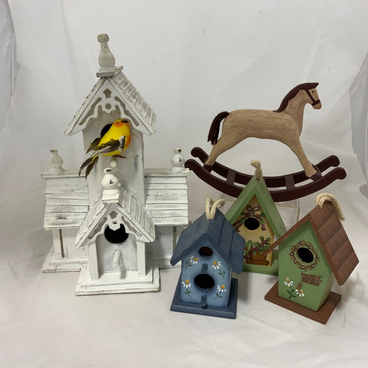 From the Estate of Peter and Alice Radovanovich: Four nice wood bird houses and a delightful small wood rocking horse. All newer construction. Please see photos for details and condition. ::: Shipping is NOT available on this lot. If you have any questions regarding this lot please contact the auctioneer either via this website, by direct email or by phone. PICK UP TIMES and other important information can be found in the TERMS and DESCRIPTION of the auction. Please take a look for pertinent information. Thanks!